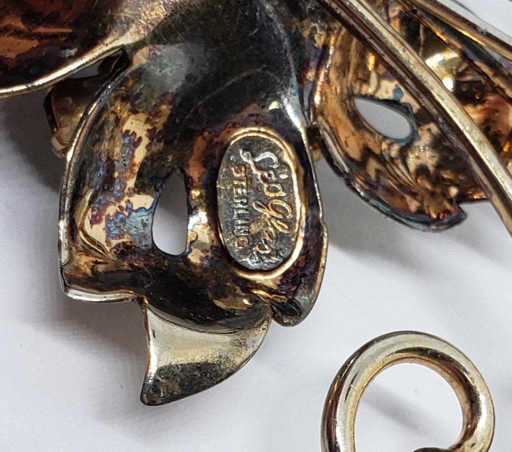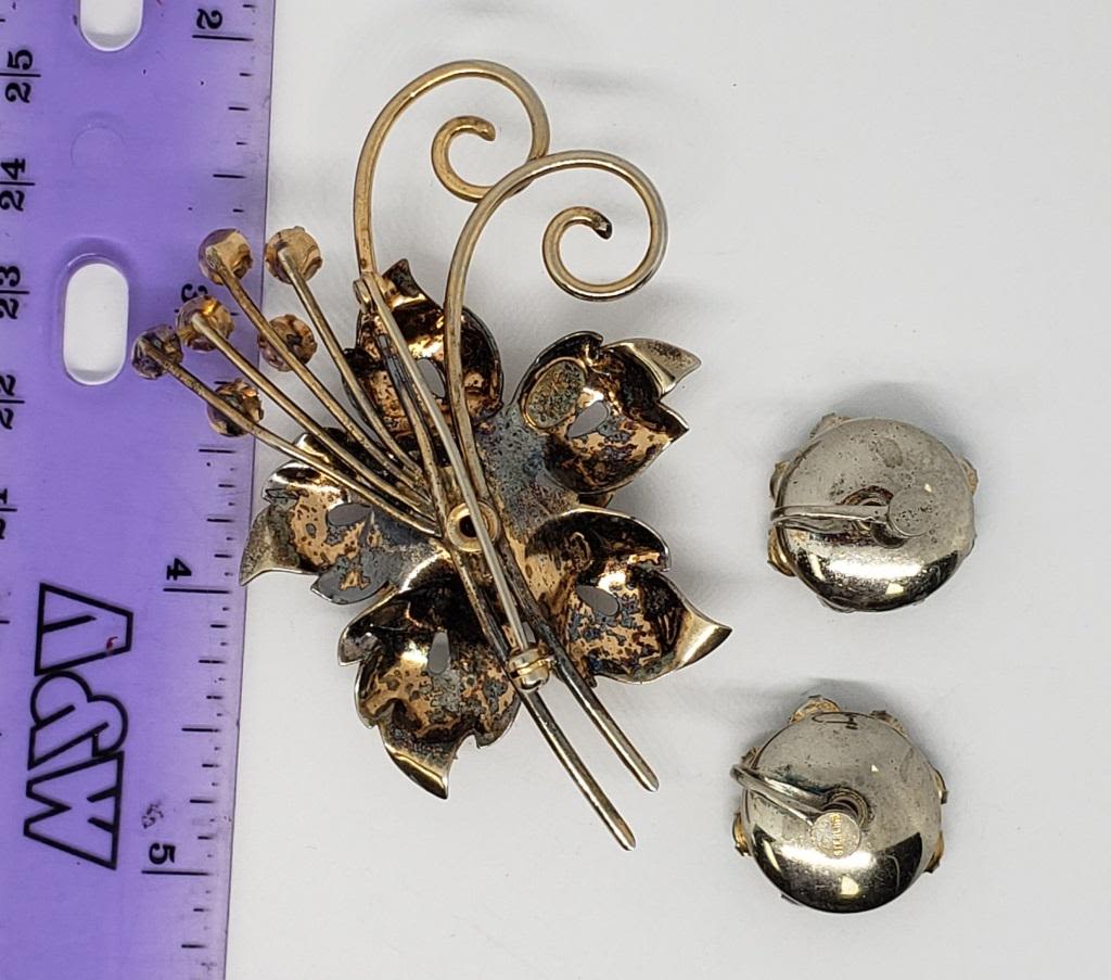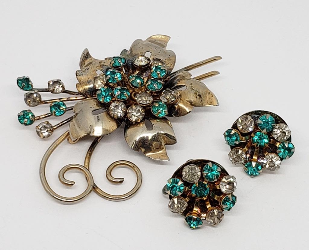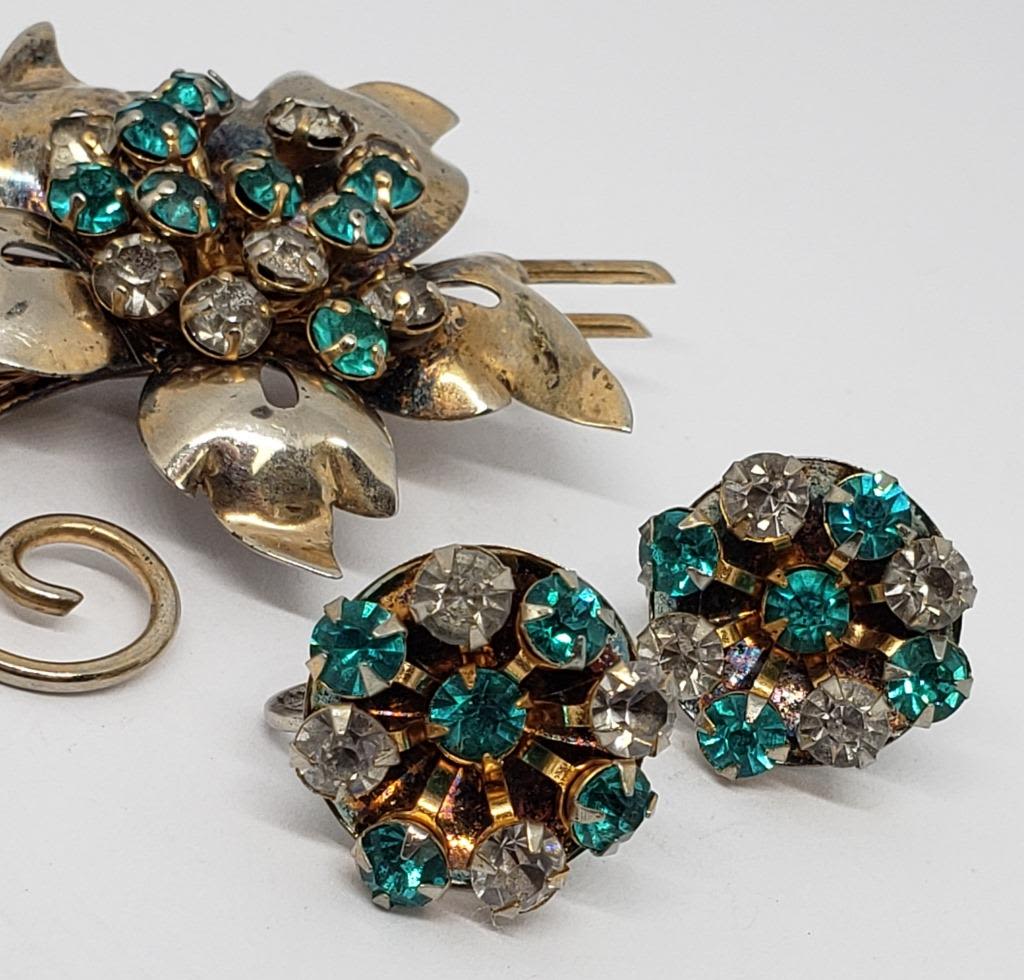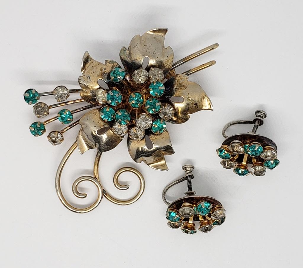 WITH MATCHING PAIR OF TWIST BACK EARRINGS-CLEAR AND TEAL STONES-TOTAL 16.2 DWT