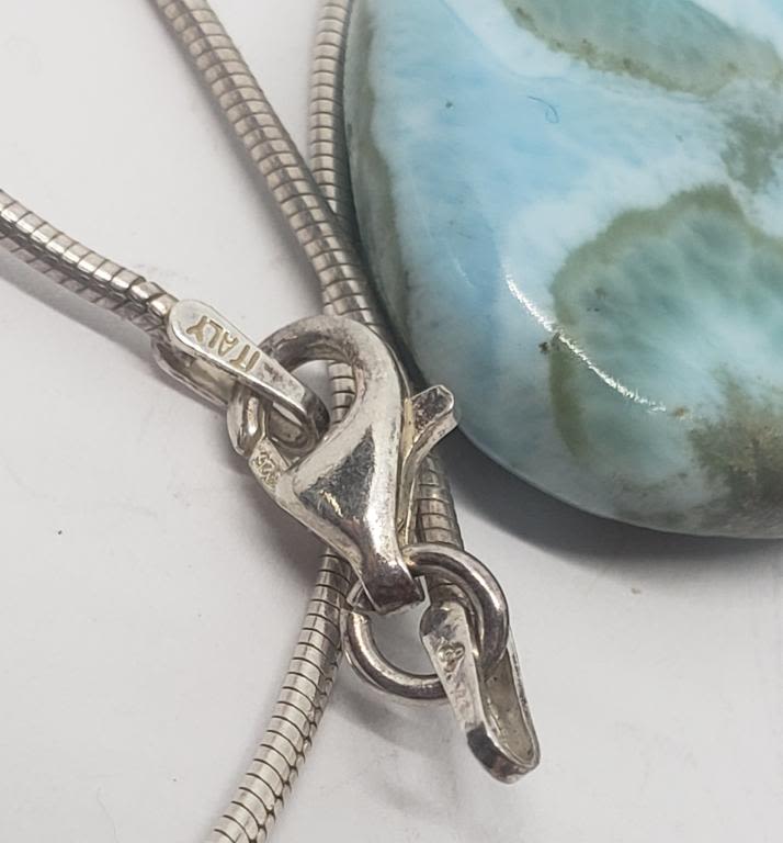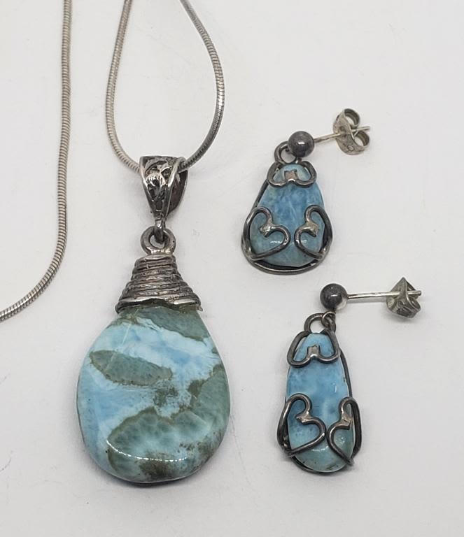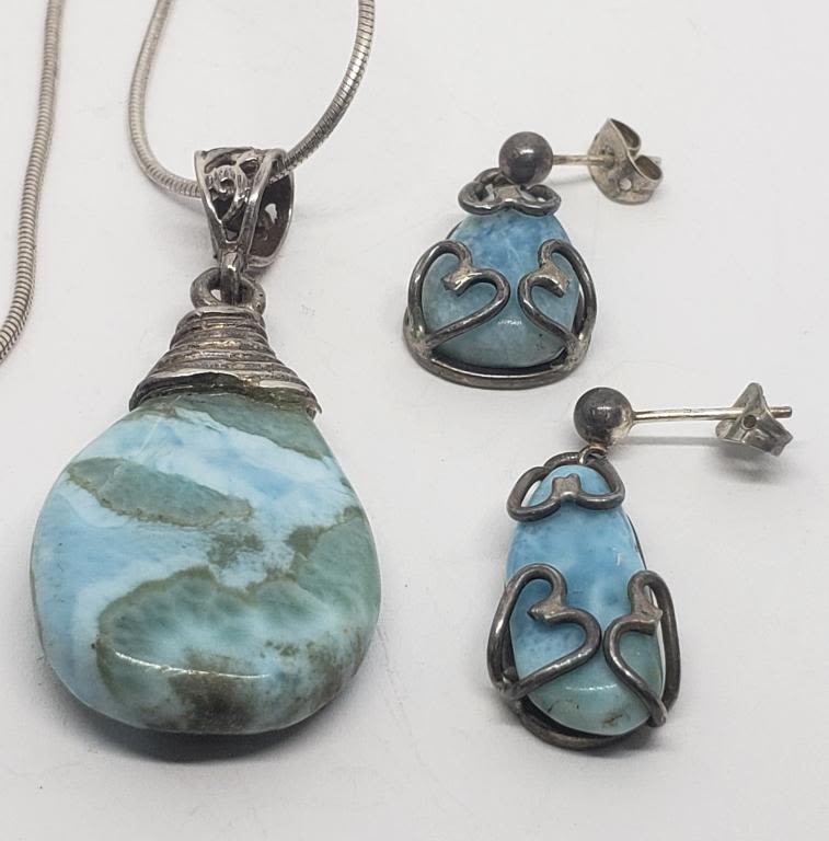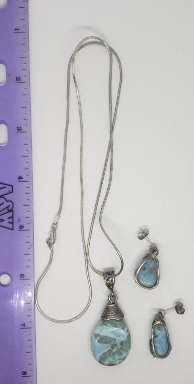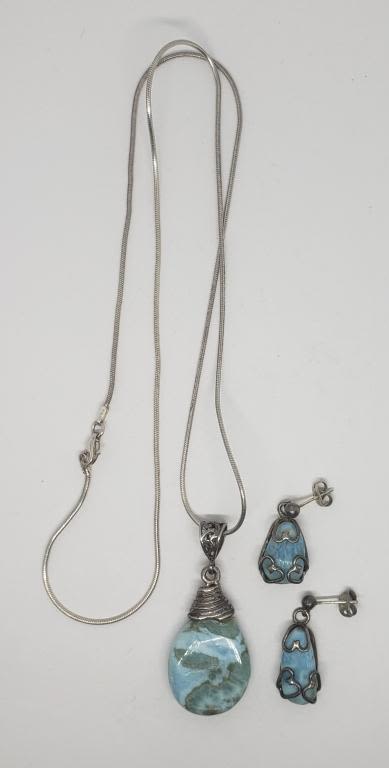 POLISHED NATURAL STONE PENDANT PLUSE (1)PAIR OF PIERCED DANGLY EARRINGS WITH LIGHT BLUE MARBLE STONE-TOTAL 14.6 DWT