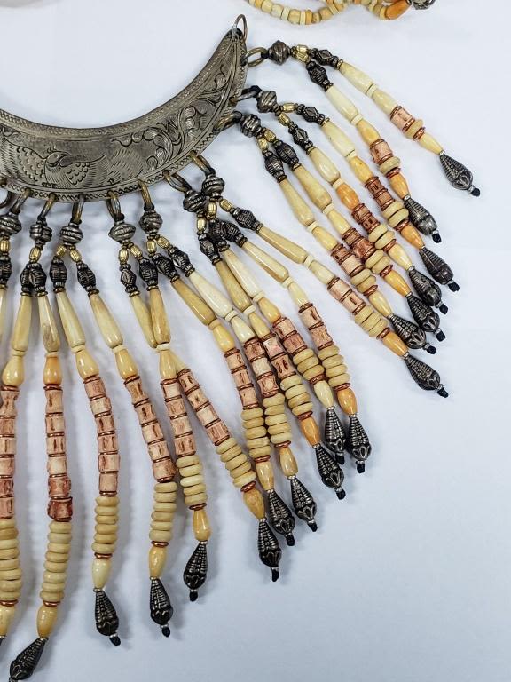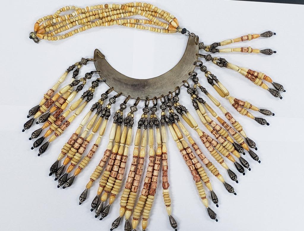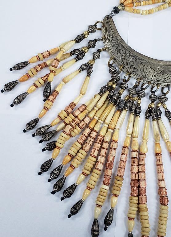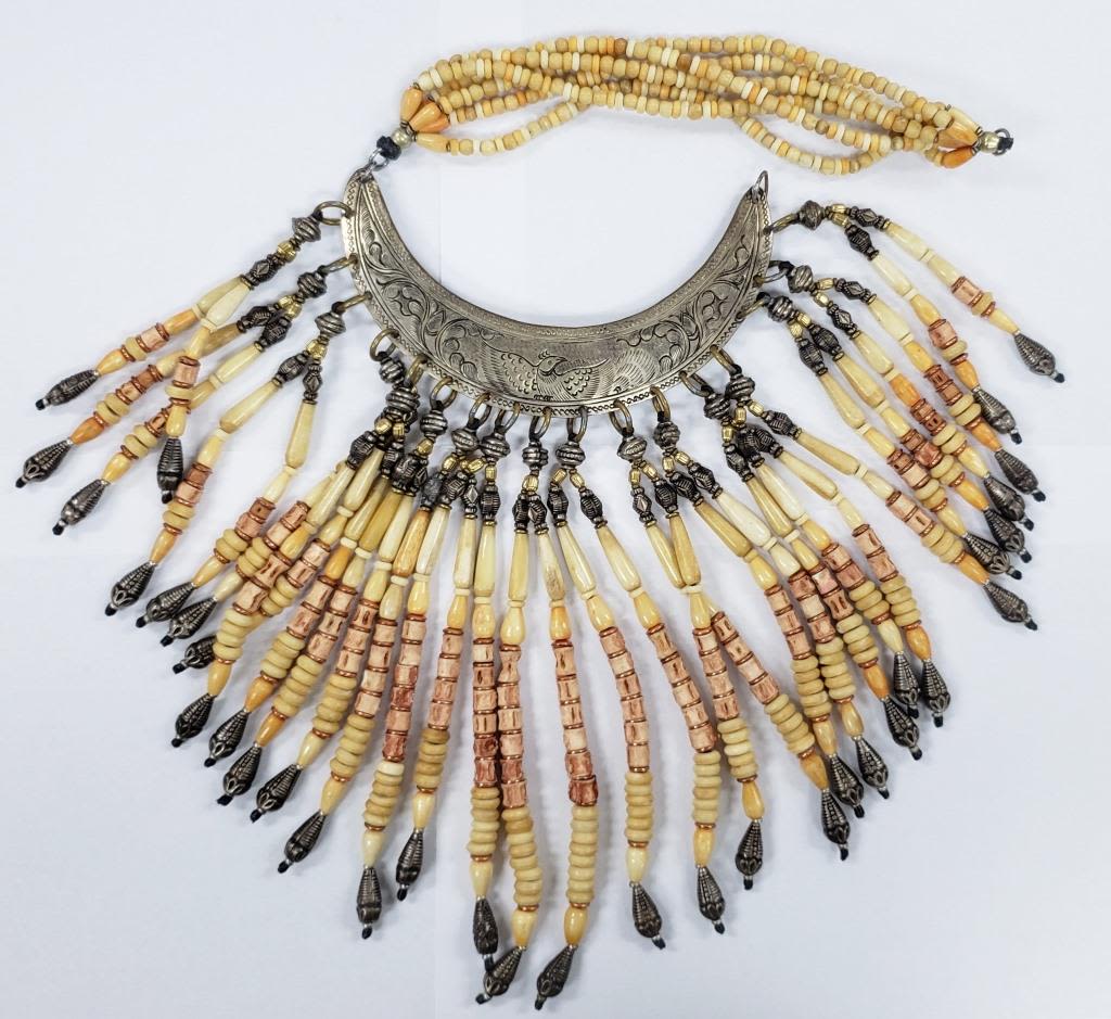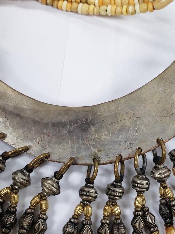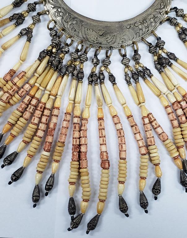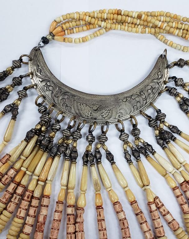 LOOKS TO BE A CERIMONIAL PIECE WITH CARVED BONE AND STERLING BEADS-BIRD ENGRAVED STERLING PIECE! HEAVY!!! TOTAL 343.6 DWT