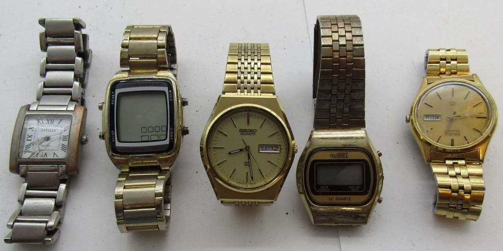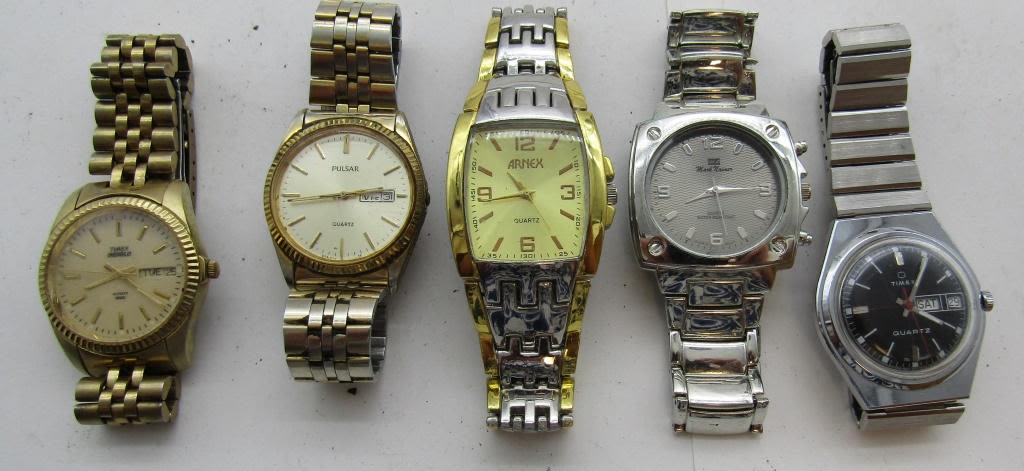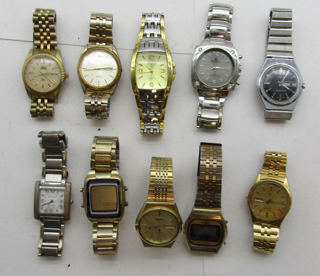 ALL UNTESTED: SOME MAY WORK, SOME MAY NOT, SOME MAY NEED BATTERIES, SOME FOR PARTS OR REPAIRS- 10 MENS QUARTZ WATCHES-(2)TIMEX-SEVILLE-QUINTEL-ARNEX-(2)SEI KO-PULSAR-MARK NAIMER-MISC
