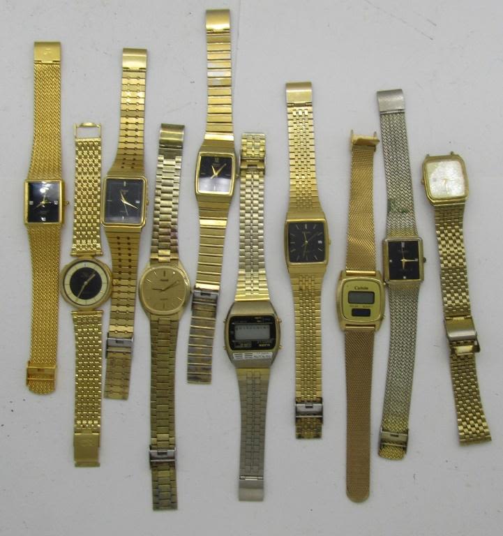 ALL UNTESTED: SOME MAY WORK, SOME MAY NOT, SOME MAY NEED BATTERIES, SOME FOR PARTS OR REPAIRS- 10 MENS QUARTZ WATCHES–XAVIER-MERCURY-(2)PULSAR-DUFONTE-CIT IZEN-CARIOLE-OSCAR DELA