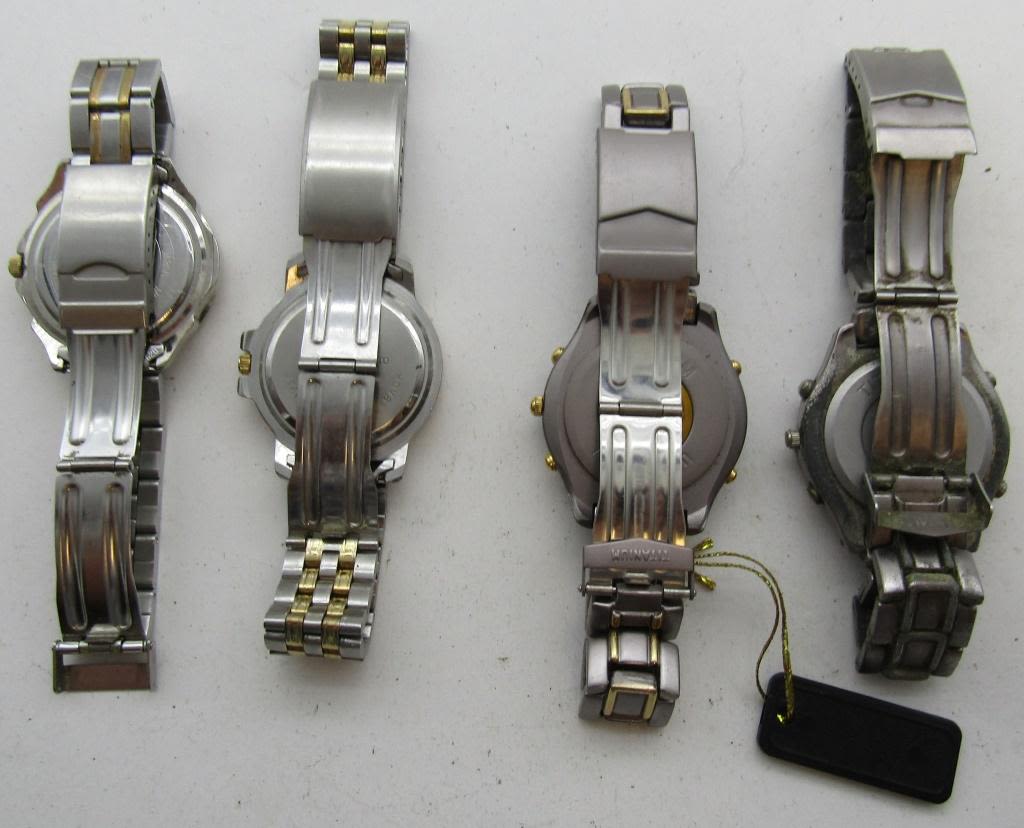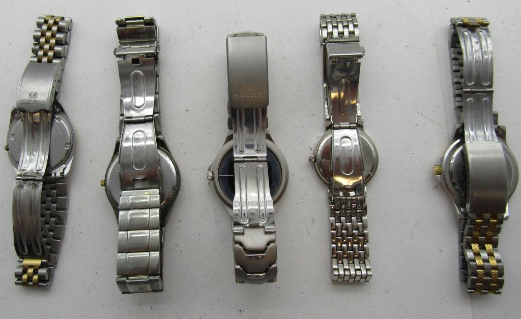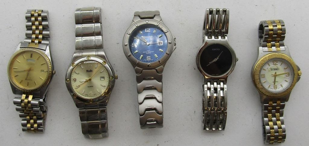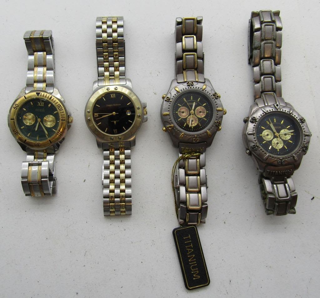 ALL UNTESTED: SOME MAY WORK, SOME MAY NOT, SOME MAY NEED BATTERIES, SOME FOR PARTS OR REPAIRS- 10 MENS QUARTZ WATCHES-GITANO-B.U.M. EQUIPMENT-(2)TITANIUM-GUESS-SERGIO VALENTE-GUCCI-MOULIN-SHARP-SEIKO-MISC