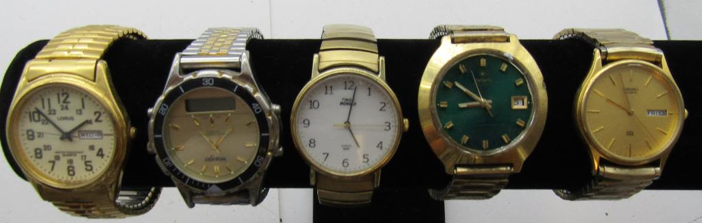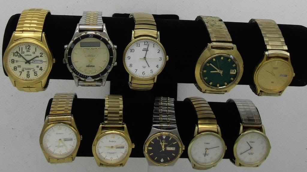 ALL UNTESTED: SOME MAY WORK, SOME MAY NOT, SOME MAY NEED BATTERIES, SOME FOR PARTS OR REPAIRS- 10 MENS QUARTZ WATCHES-10 MENS STRETCH BAND QUARTZ WATCHES -SEIKO-WRANGLER-(3)TIMEX-ELGIN-(2)ARMITRON-LO