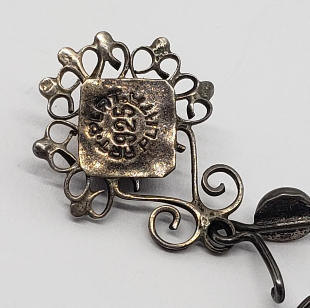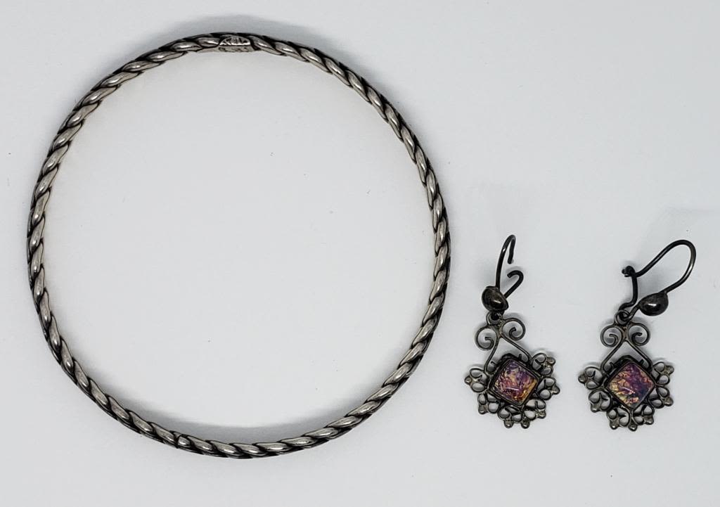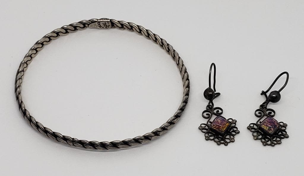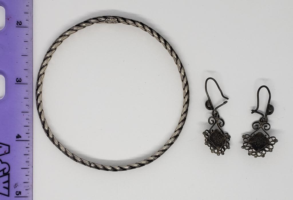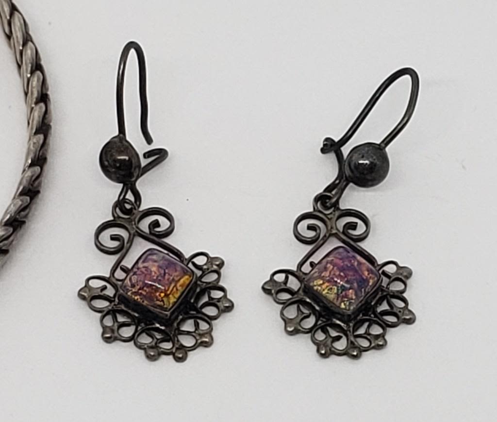 MEXICO STERLING DANGLY EARRINGS WITH MEXICAN OPAL-FILIGREE BORDER-BANGLE IS A BRAIDED DESIGN-TOTAL 11.4 DWT