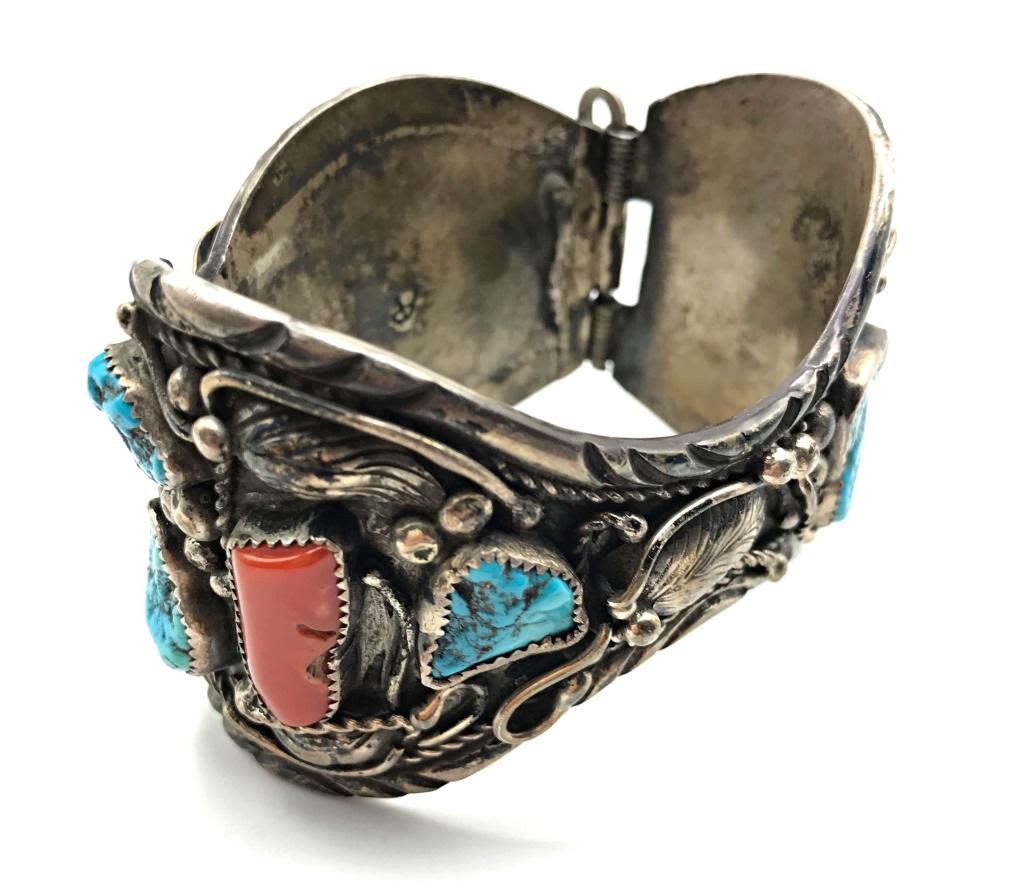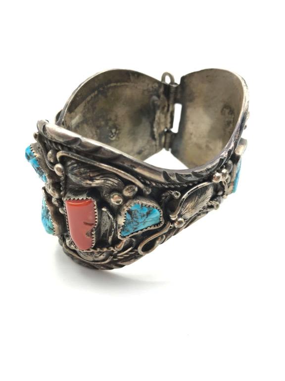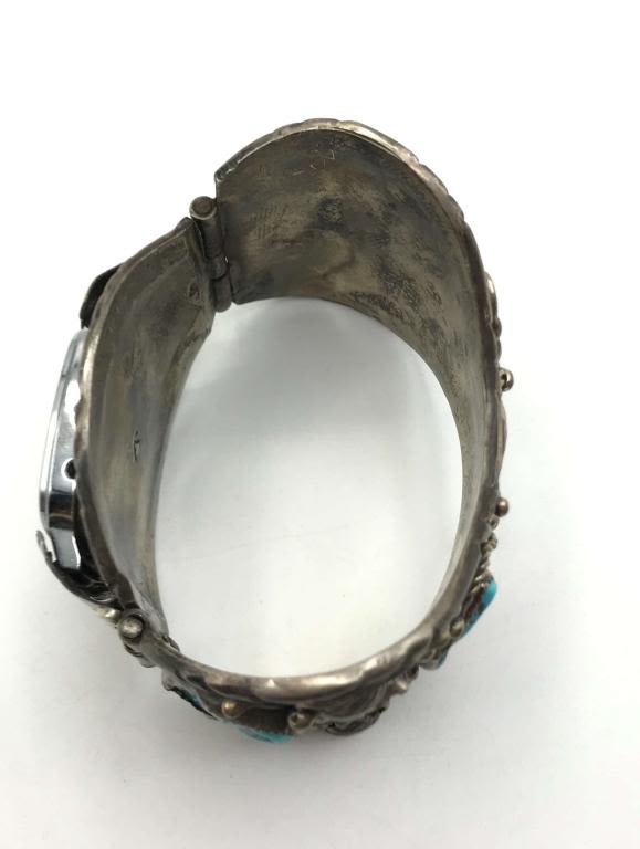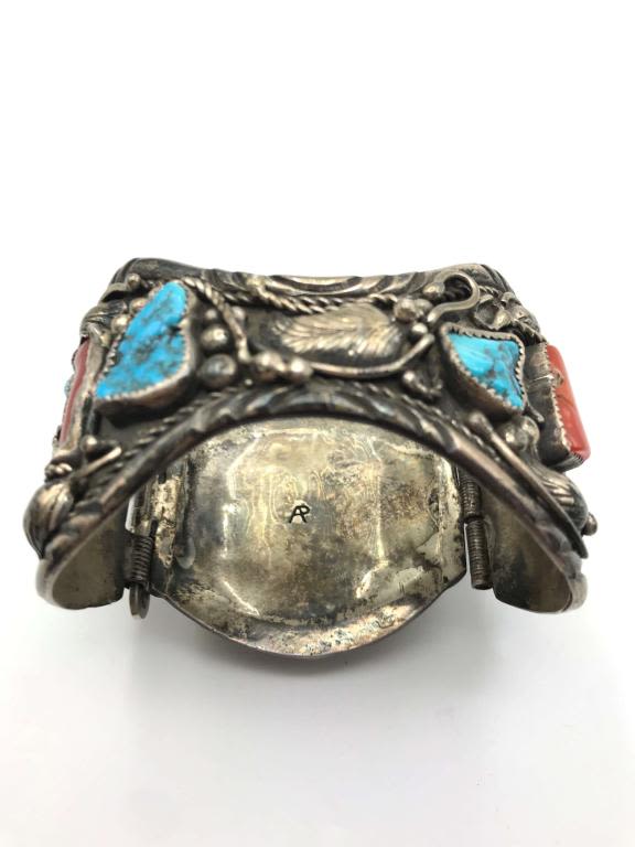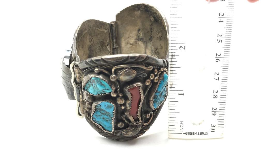TURQUOISE AND CORAL STERLING WATCH HOLDER. RARE! VINTAGE. MUST SEE PHOTOS! (93.85 DWT)