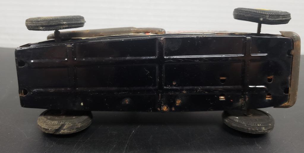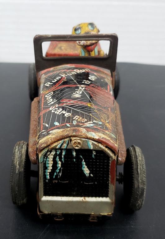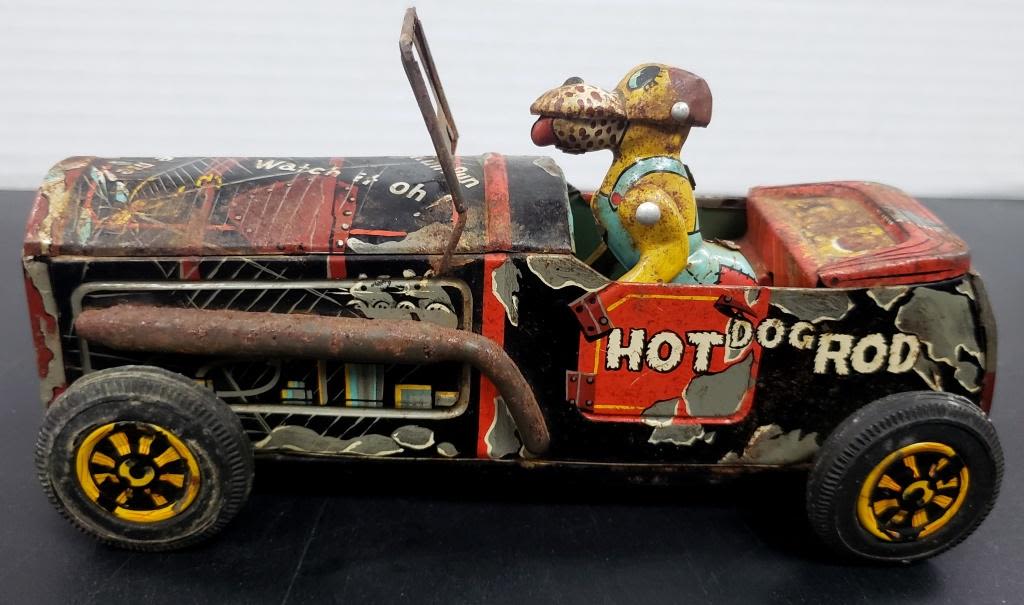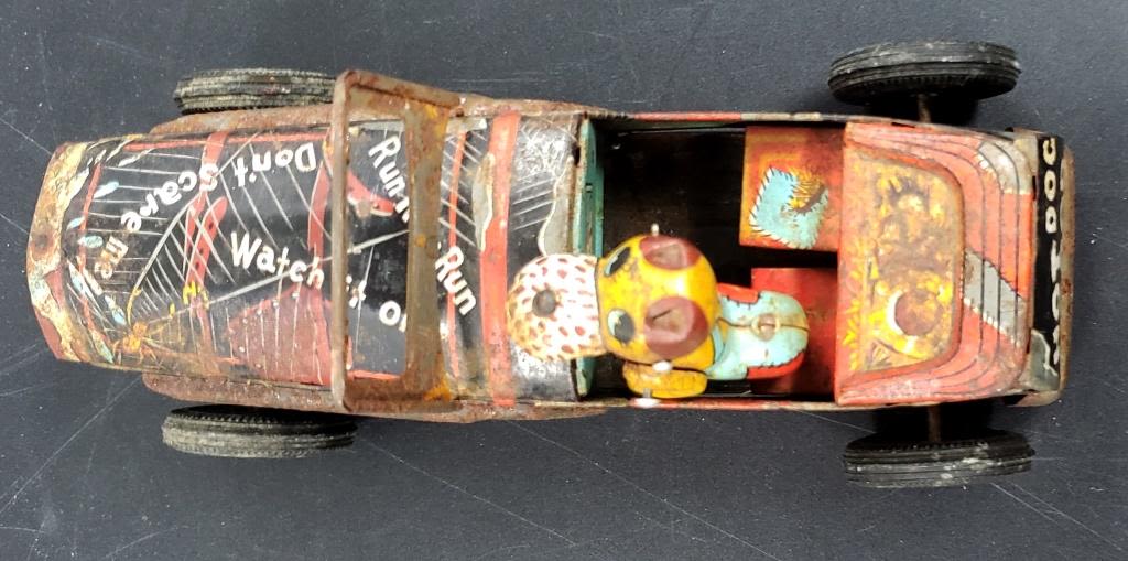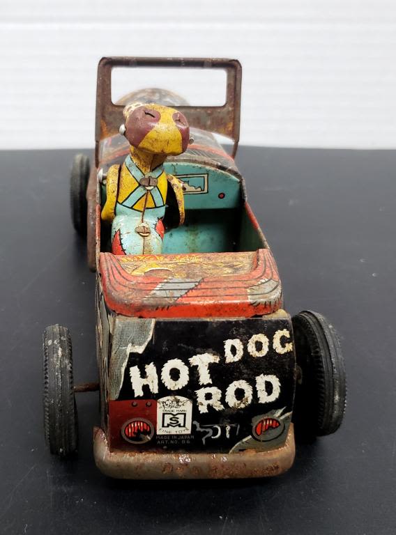 MADE IN JAPAN TIN FRICTION "HOT DOG ROD" TOY CAR with DOG – SHOW WEAR MISSING STEERING WHEEL & FRONT BUMPER / LIGHTS – FRICTION WORKS