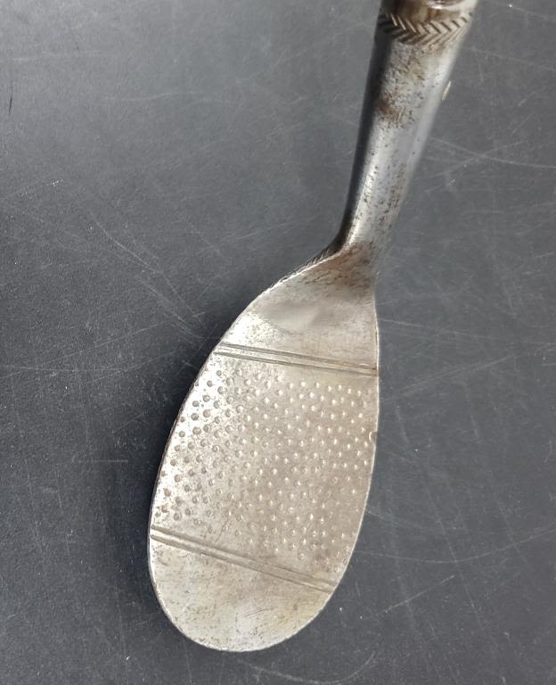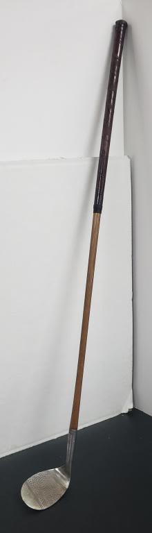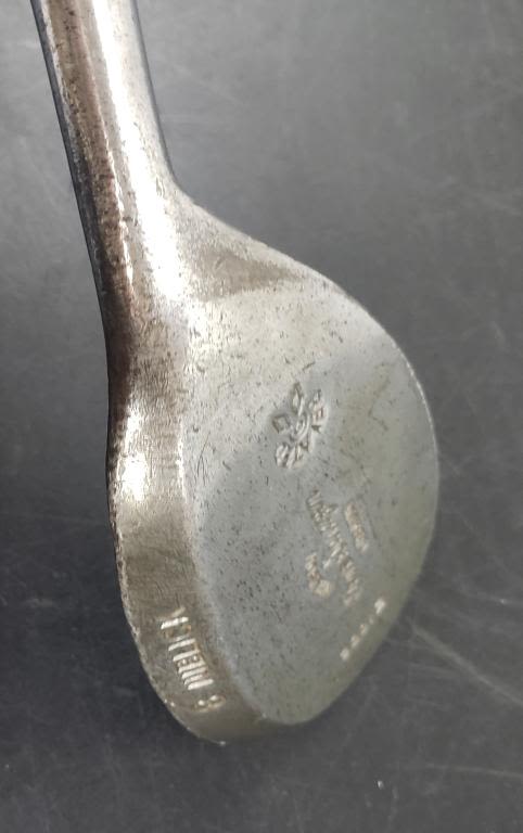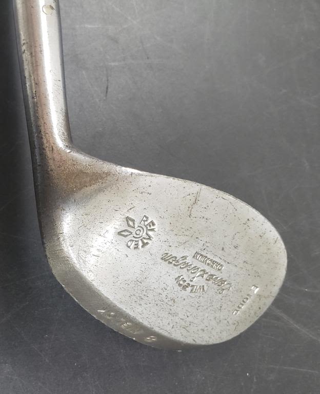 #8 NIBLICK LARGE ROUND SHAP with DOT PUNCHED PATTER FACE with E1002 & DESIGN STAMP – HICKORY WOOD SHAFT with LEATHER GRIP & ORIGINAL THREAD WRAP – IN GOOD ORIGINAL CONDITION – CIRCA 1920’s