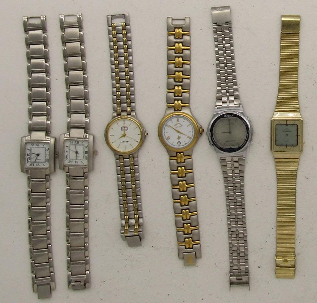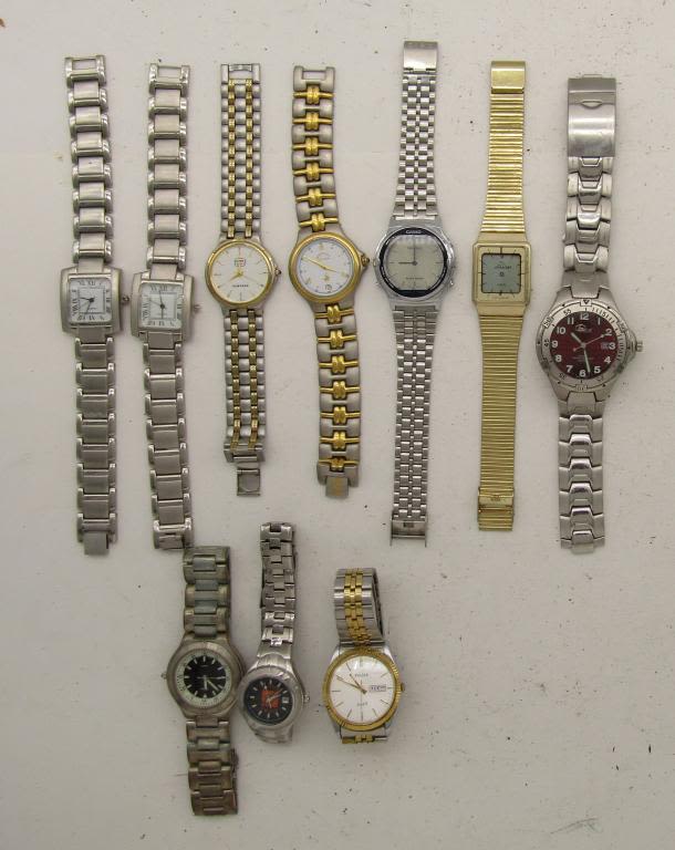 NOT TESTED AS TO WORKING OR NOT-SOME FOR PARTS OR REPAIRS-SOME MAY WORK–MOST WILL NEED BATTERY REPLACEMENT-PULSAR -TERNER-(2)SKC-CASIO-JORDACHE-SAMSUNG-BUM EQUIPMENT-MISC