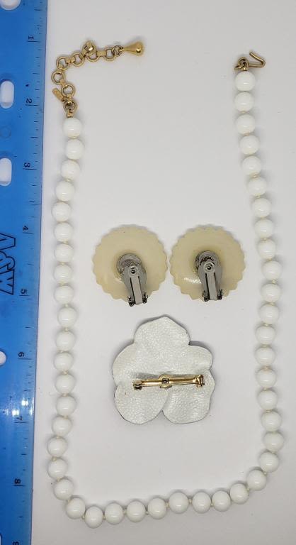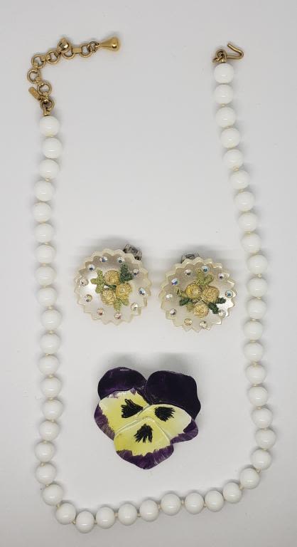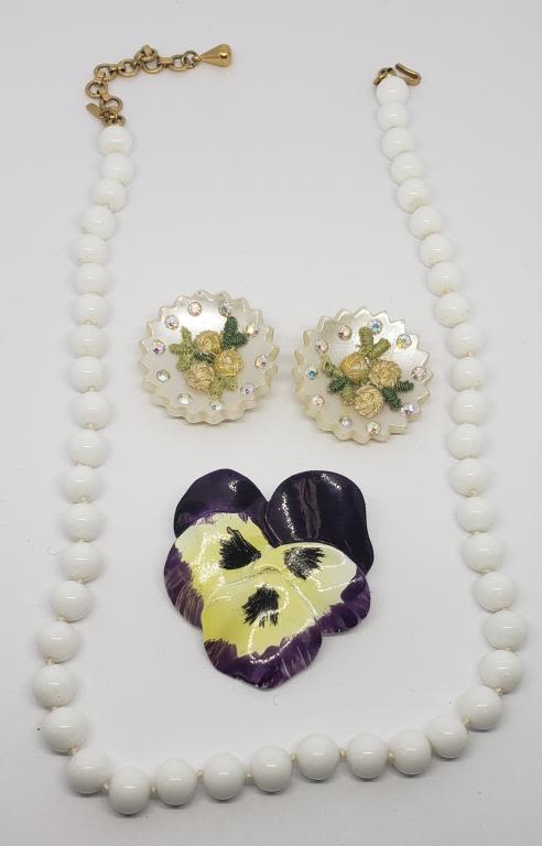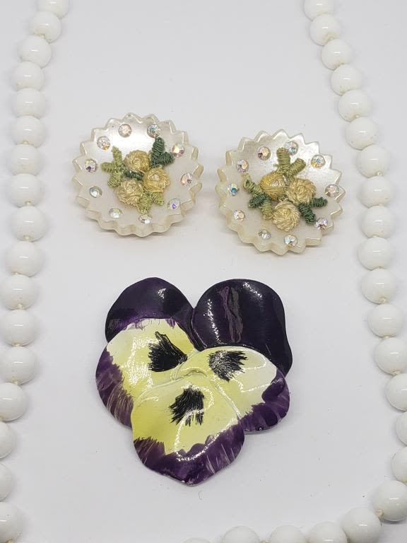 NECKLACE (1)PAINTED METAL FLOWER BROOCH (1)PAIR OF SILVER TONED CLIP ON LUCITE EARRINGS