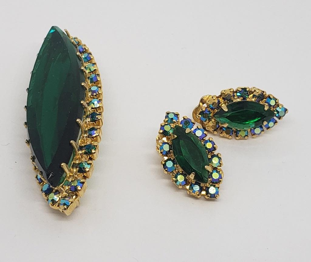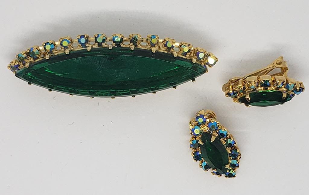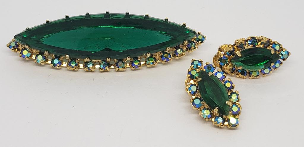 GREEN RHINESTONE CENTER-RHINESTONE BORDER WITH MATCHING PAIR OF CLIP ON EARRINGS-LOOKS NEW!!!!
