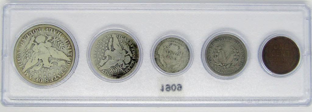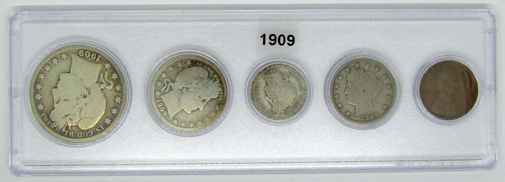 LINCOLN CENT, 1909 LIBERTY "V" NICKEL, 1909-O BARBER DIME, 1909 BARBER QTR, 1909-S BARBER HALF DOLLAR – in CAPITOL HOLDER