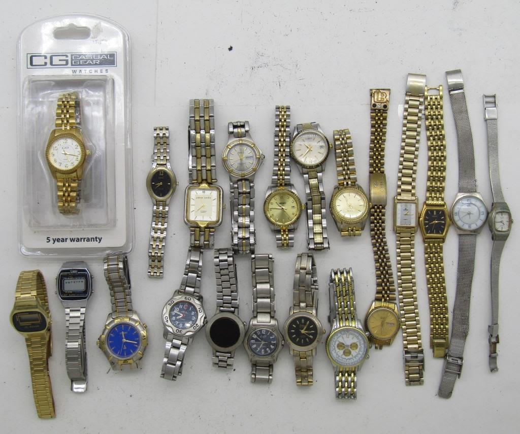 ALL UNTESTED: SOME MAY WORK, SOME MAY NOT, SOME MAY NEED BATTERIES, SOME FOR PARTS OR REPAIRS- 20 LADIES QUARTZ WATCHES-CG-CITIZEN-PIERRE CARDIN-(3)TIMEX-SILER-(4)SEIKO-ARMITRON-LITRO