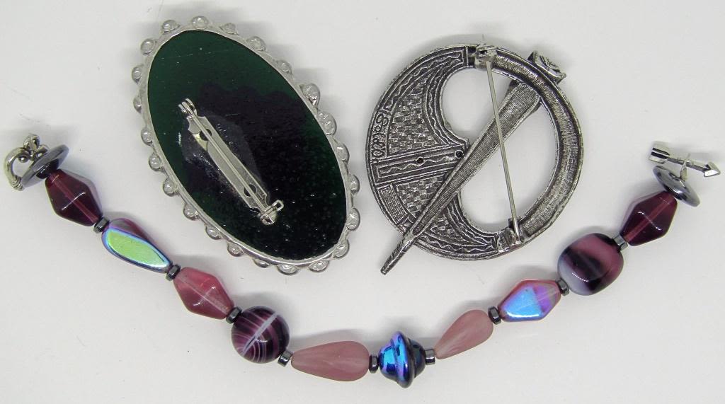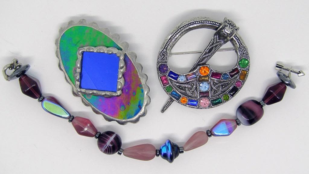 (1)BROOCH WITH MULTI COLORED RHINESTONES (1)PURPLE BEADED BRACELET