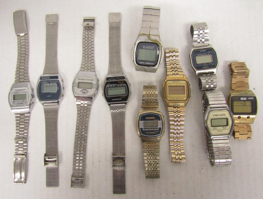 10 MENS QUARTZ DIGITAL WATCHES-NOT TESTED AS TO WORKING OR NOT-SOME FOR PARTS OR REPAIR-SOME MAY WORK-(2)SEIKO, NELSONIC, MICRONTA, TIMEDESIGN, CR ONO ALARM, LA CROSSE, CASIO, ECT