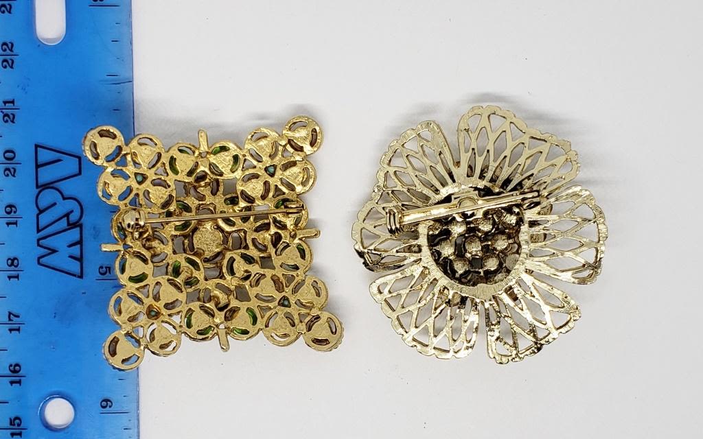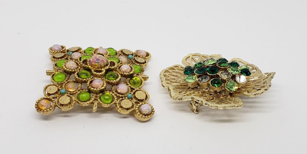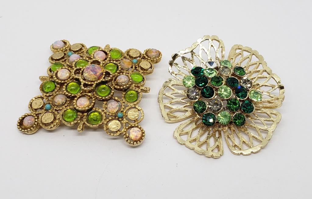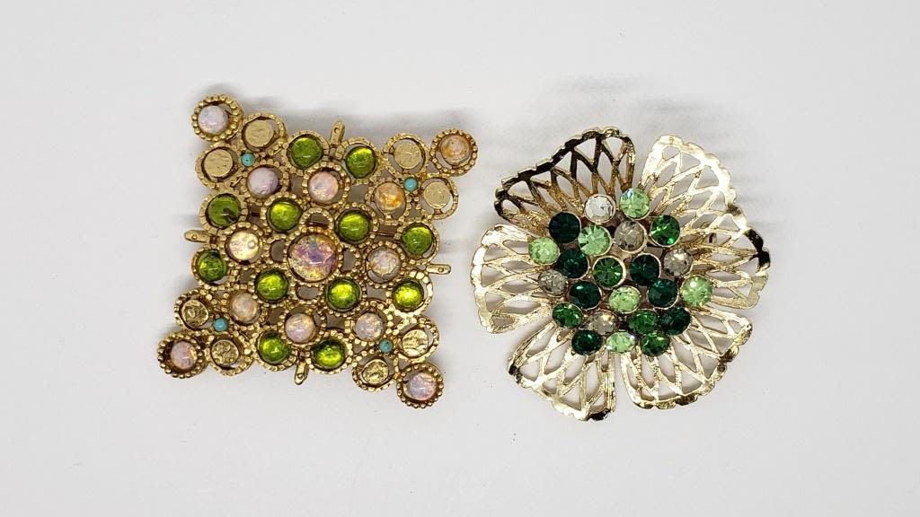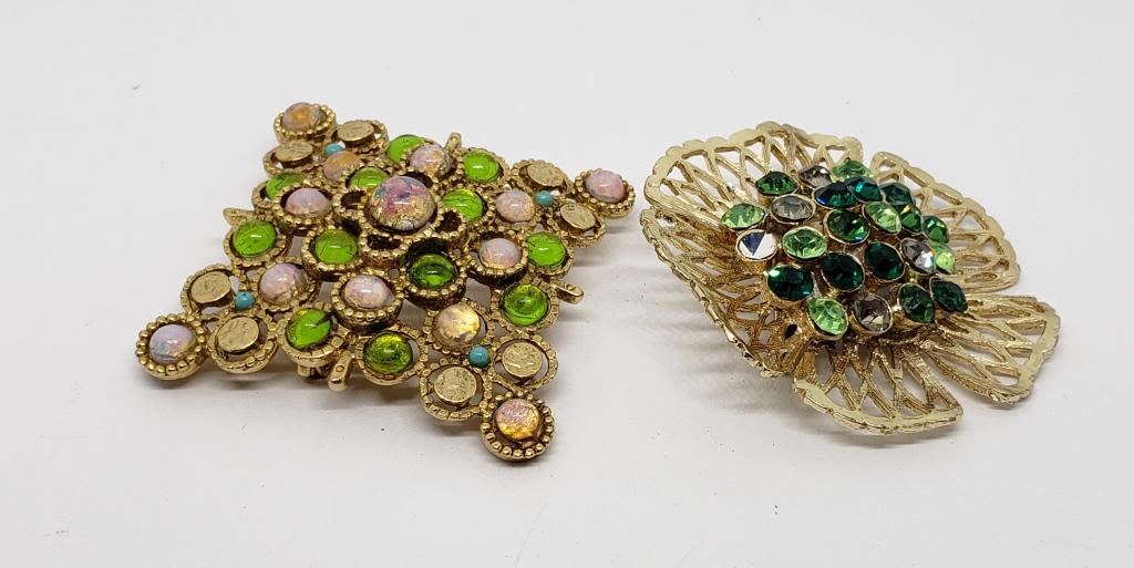 AND GREEN AND CLEAR RHINESTONE CLUSTER & (1)WITH LIME GREEN AND METALLIC PURPLE LUCITE CLUSTER