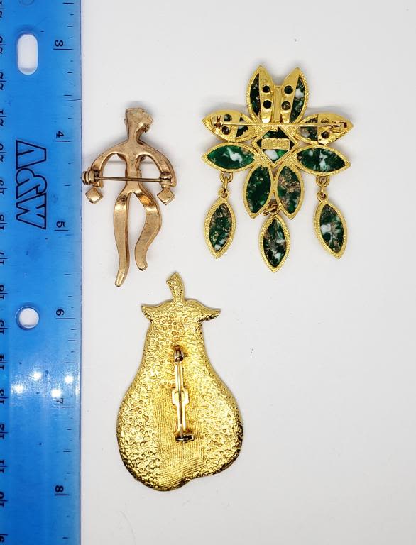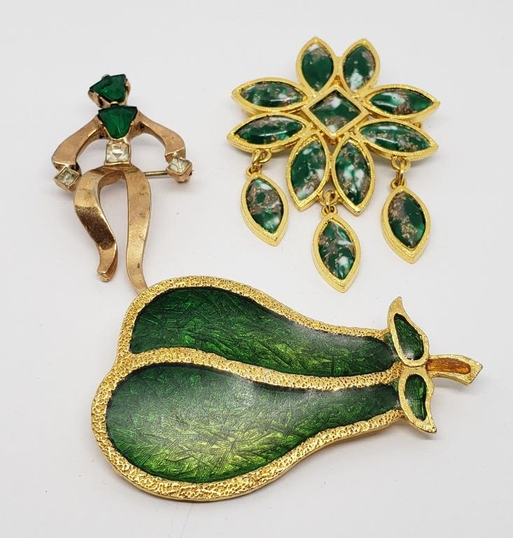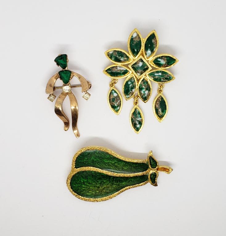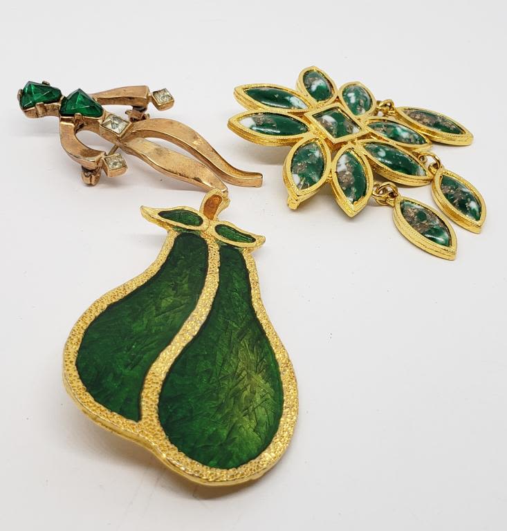 CLEAR AND EMRALD GREEN RHINESTONES (1)CELEBRITY FLOWER WITH DANGLY CHARMS-MARBLE GREEN LUCITE (1)PEAR WITH GREEN RESIN AND BROWN STEM