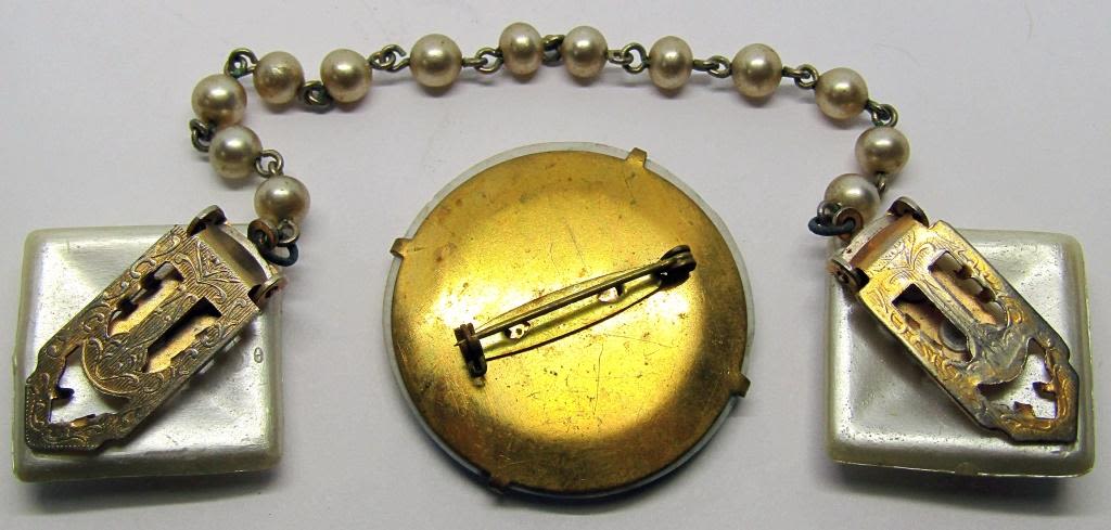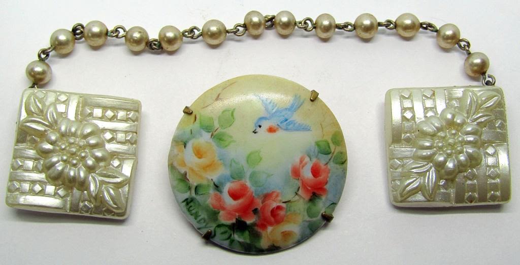CARVED FLOWER LUCITE AND FAUX PEARLS PLUS (1)GOLD TONED CIRCULAR WITH PAINTED BIRD AND FLOWER PORCELIN CENTER