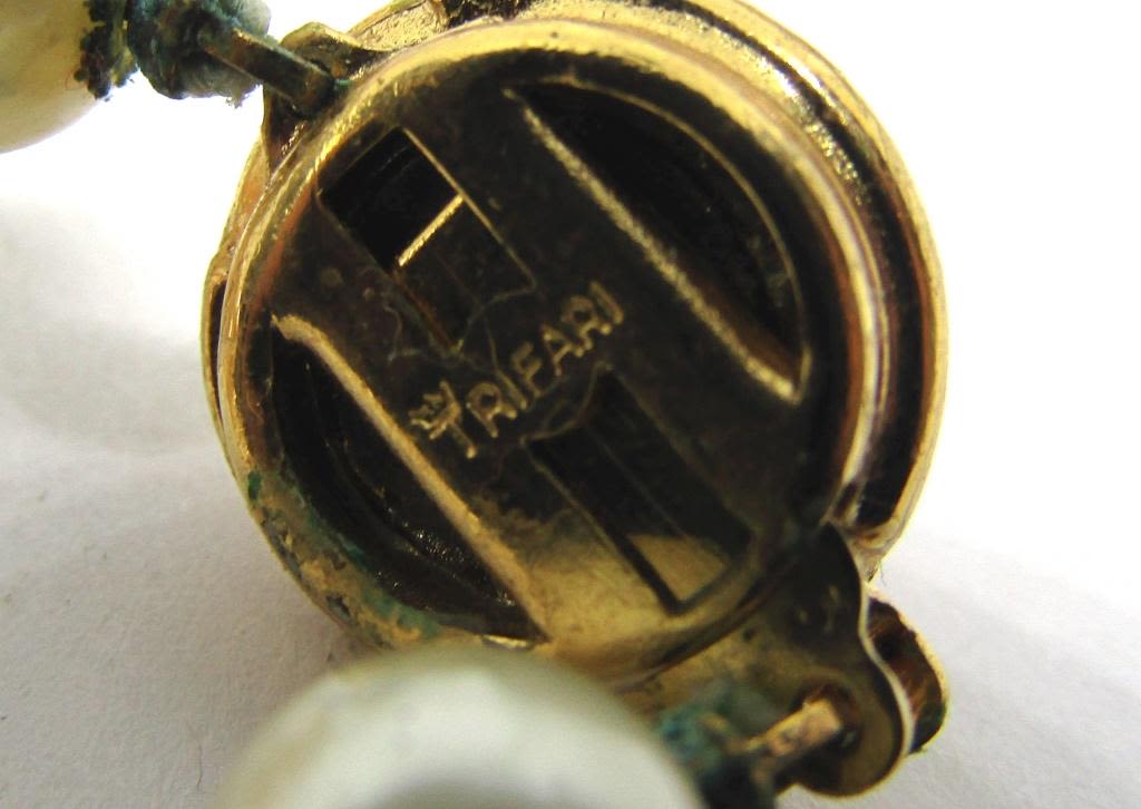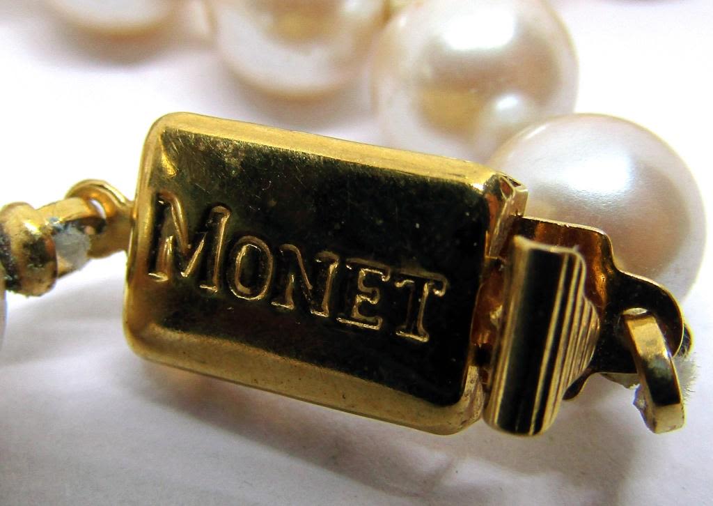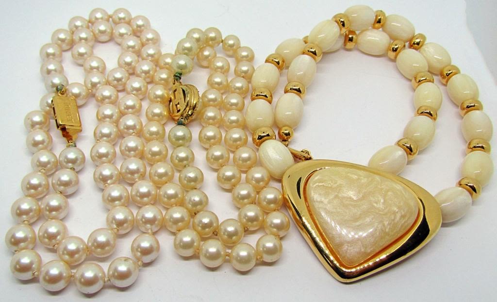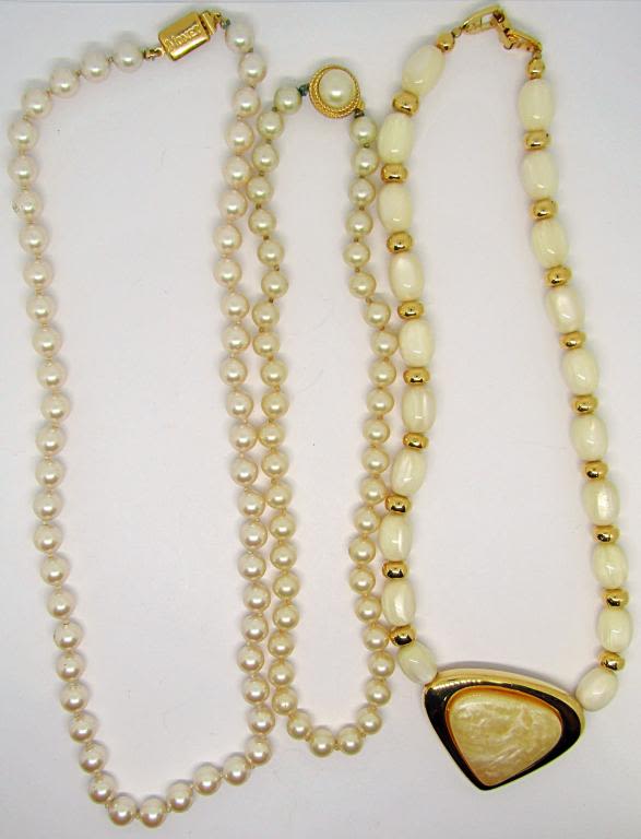 (1)NAPIER WITH CRÈME BEADED GOLD TONED PENDANT WITH CRÈME LUCITE CENTER (1)TRIFAIR WITH FAUX PEARLS (1)MONET WITH FAUX PEARLS