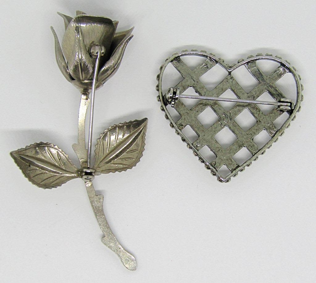 SILVER TONED HEART BROOCH WITH FAUX PEARLS AND RHINESTONES
