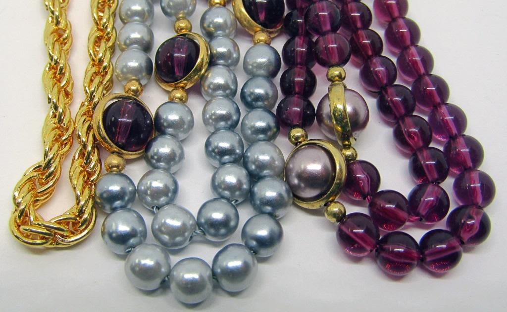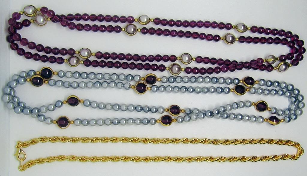 GOLD TONED NECKLACE/CHAIN-PURPLE-GRAY BEADS