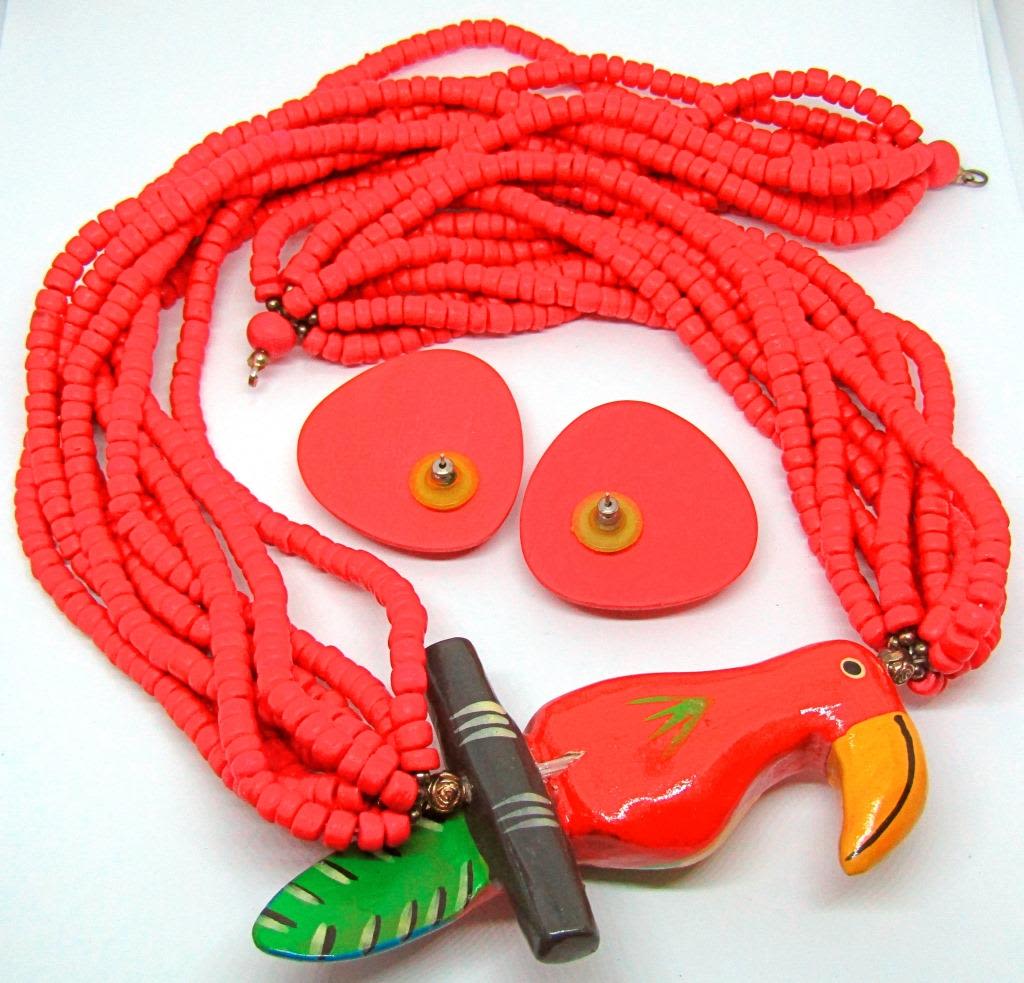 WITH LARGE PAINTED WOODEN TUCAN (CLASP IS BROKEN/BUT FIXABLE) WITH MATCHING PAIR OF PIERCED EARRINGS