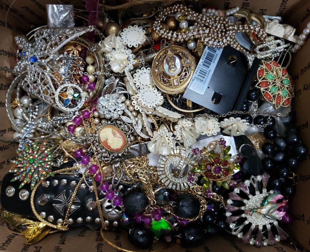 EACH LOT is UNIQUE! ABSOLUTELY A TREASURE HUNT – SOME PIECES MISSING STONES or NEEDING REPAIRED – GREAT FOR THE PINTEREST / CRAFT PERSON. MANY ITEMS NAMED – MEDIUM FLAT RATE BOX FULL (Shipping is MED. FLAT RATE COST)