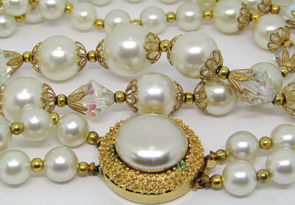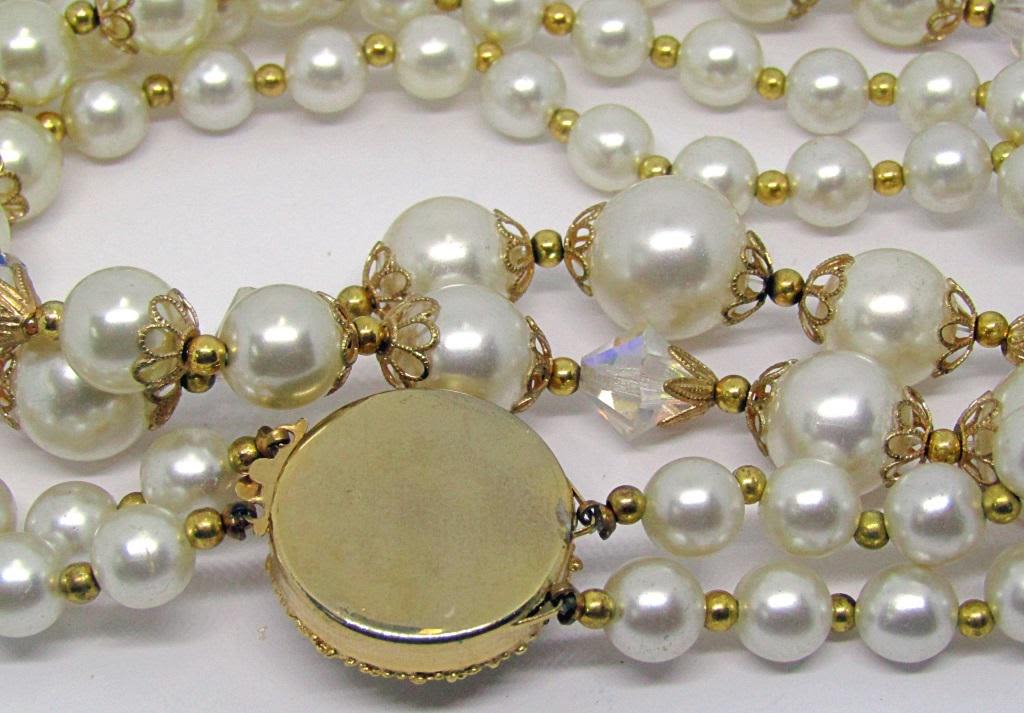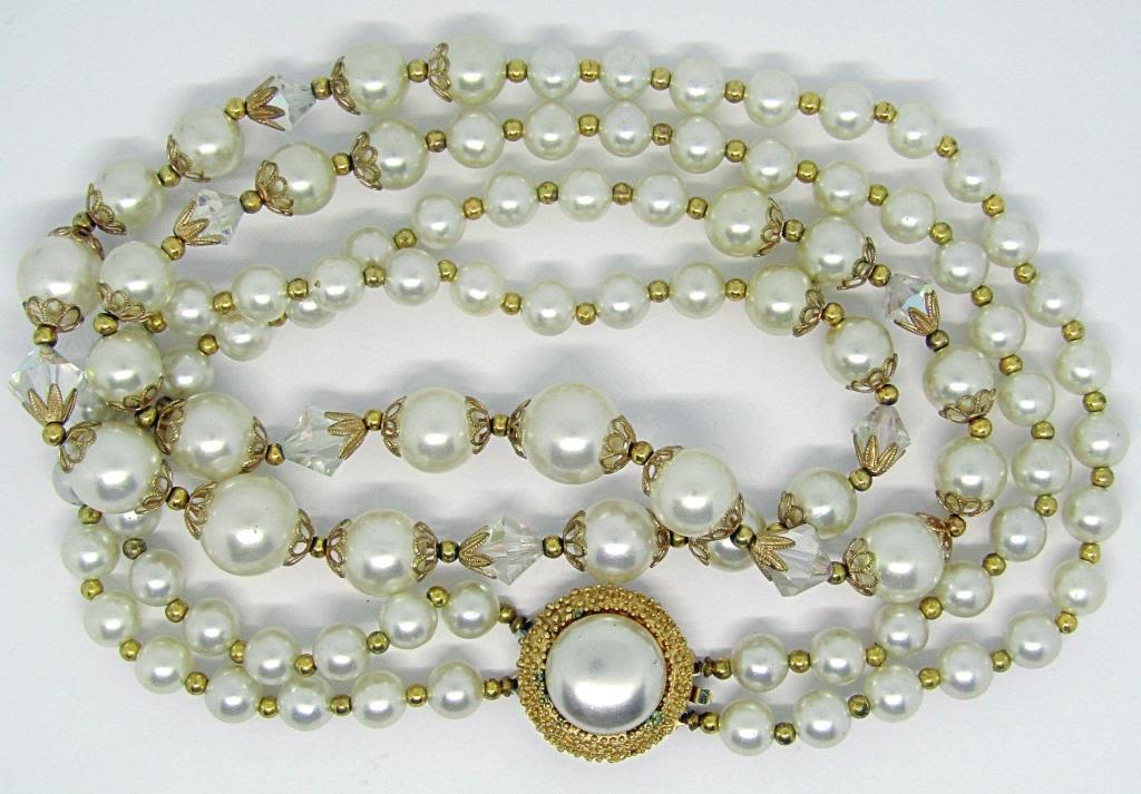 BEADED NECKLACE WITH CLEAR BEAD ACCENTS-GOLD TONED CLOSURE WITH CRÈME LUCITE CENTER