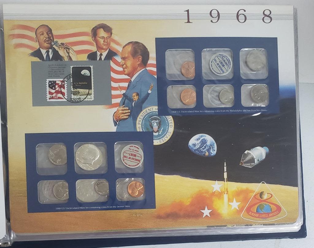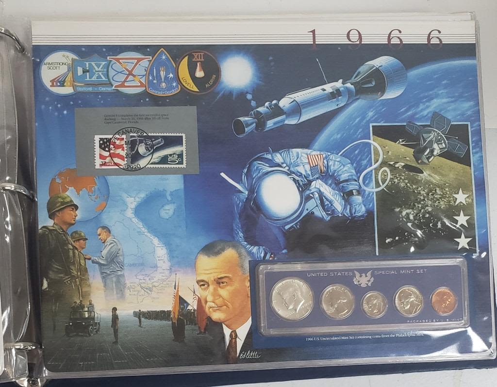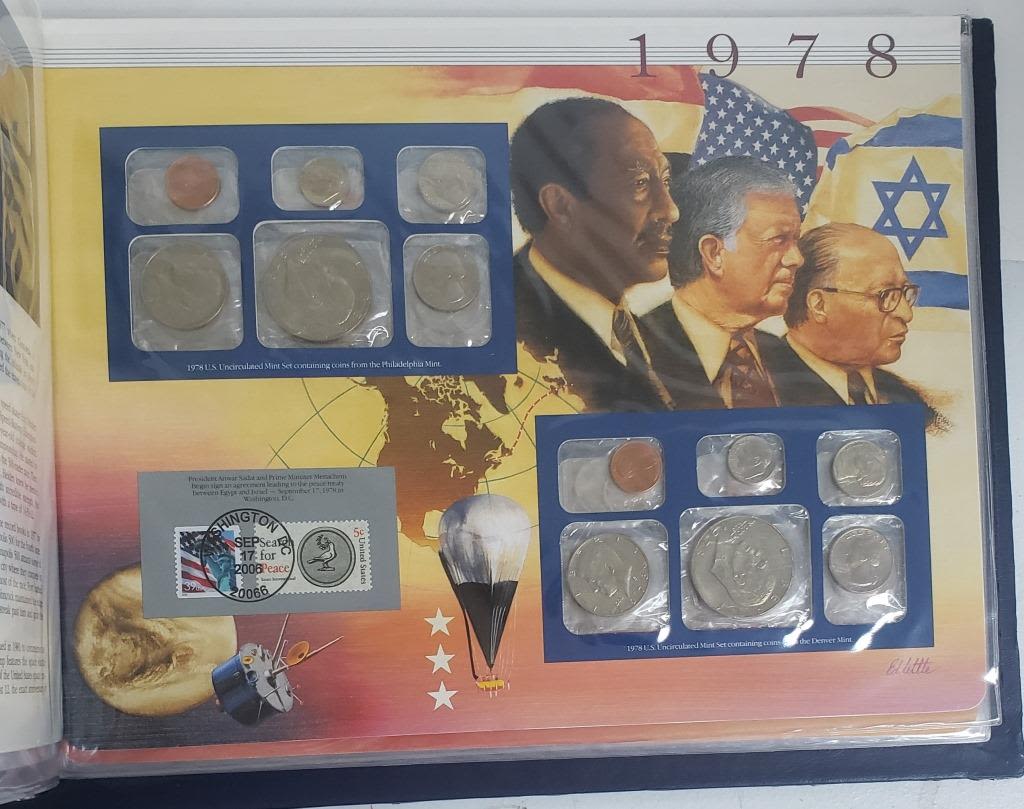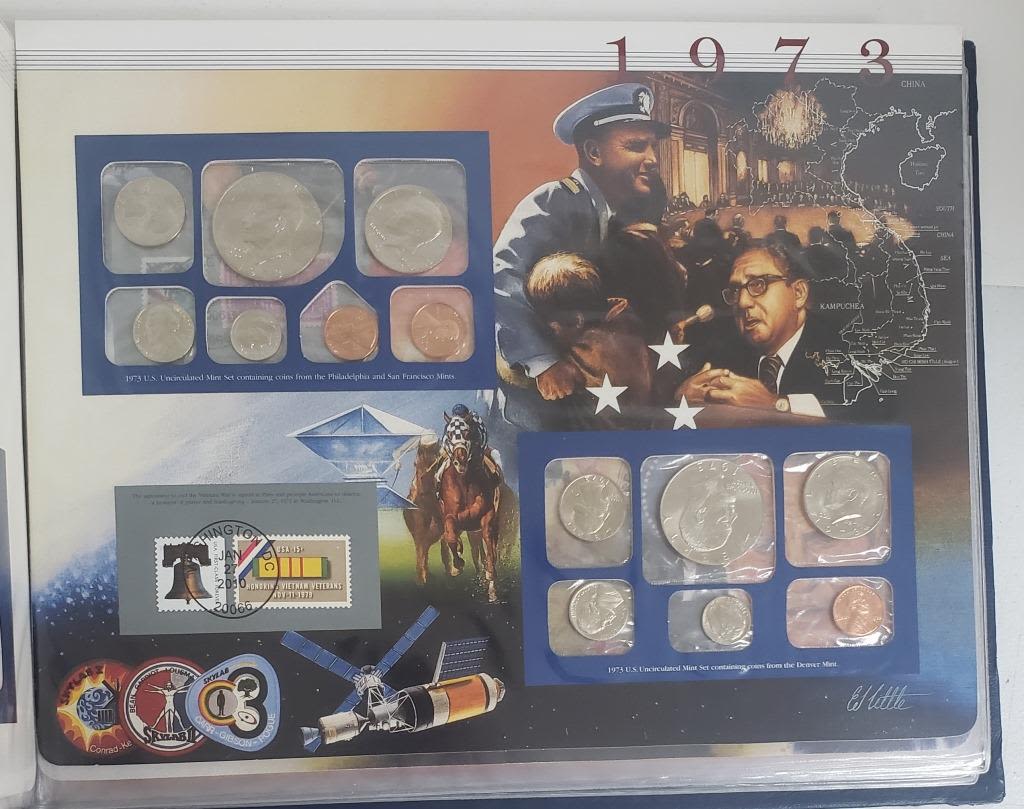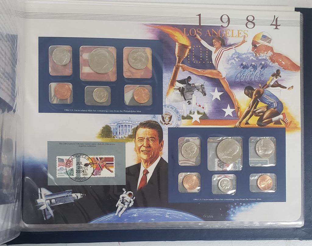 COLLECTION of ORIGINAL U.S. MINT SETS with STAMPS in POSTAL COMMEM ALBUM – 1965 thru 1981 includes 1976 3pc SILVER, 1984 thru 1990