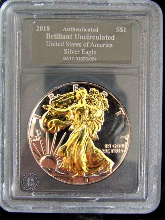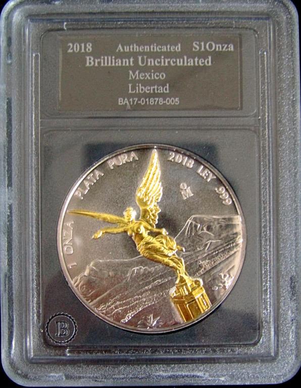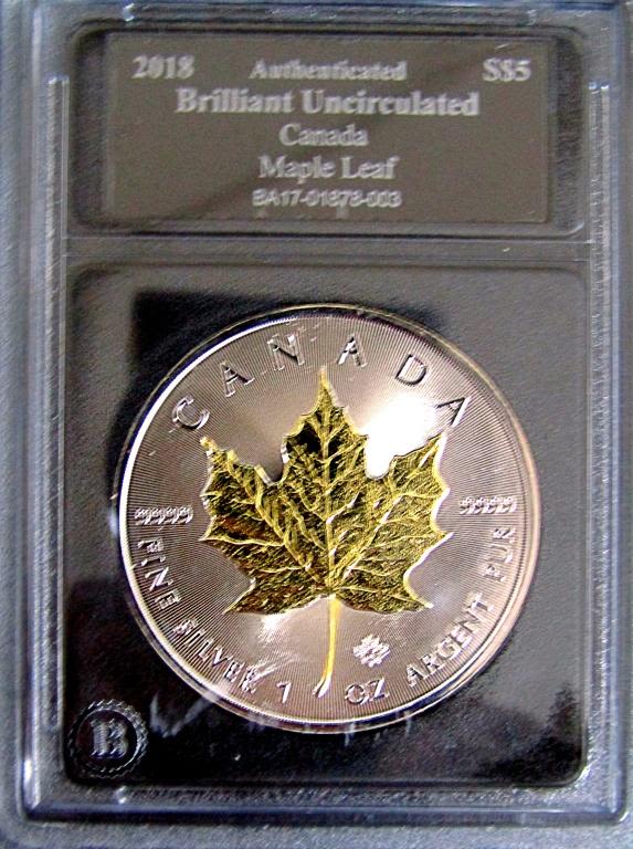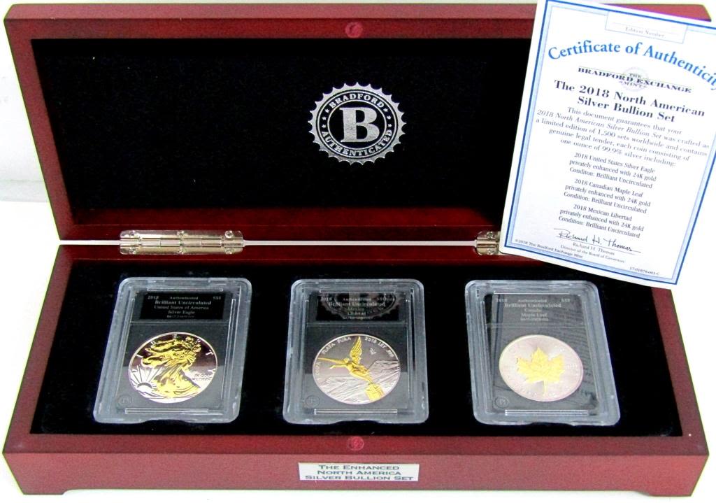 24k GOLD ENHANCED 2018 AMERICAN SILVER EAGLE, 2018 MEXICO LIBERTAD, 2018 CANADA MAPLE LEAF in CHERRY WOOD BOX by BRADFORD EXCHANGE in AUTHENCIATED BRADFORD HOLDERS