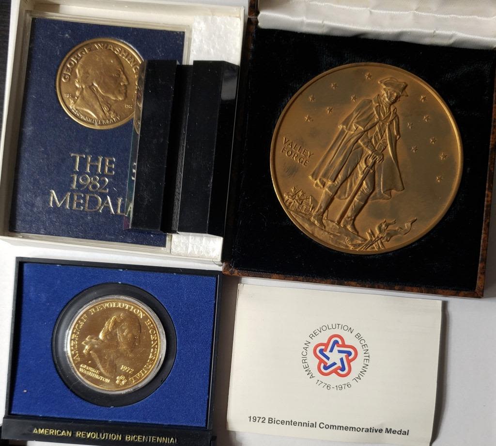 (1)1978 VALLEY FORGE NATIONAL MEDAL (1)1972 AMERICAN REVOLUTION BICENTENNIAL COMMEMORATIVE MEDAL & (1)1982 HISTORICAL SOCIETY GEORGE WASHINGTON MEDAL
