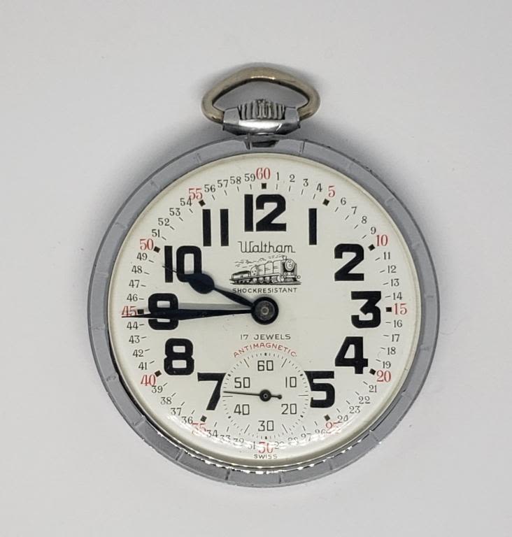 MONTGOMERY DIAL, 17 j, CHROME SNAP BACK CASE with TRAIN ENGRAVING – WORKING CONDITION