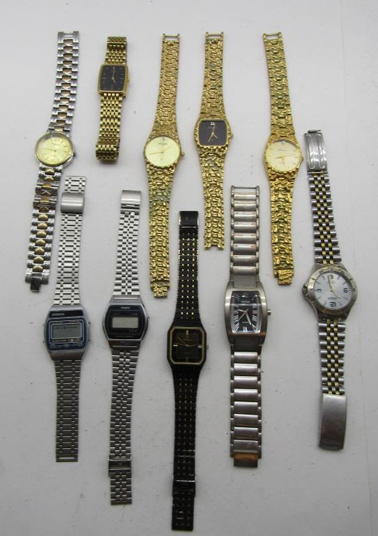 ALL UNTESTED: SOME MAY WORK, SOME MAY NOT, SOME MAY NEED BATTERIES, SOME FOR PARTS OR REPAIRS- 10 MENS QUARTZ WATCHES–CASIO-(2)PIERRE BIDEAUX-CITIZEN-TERNER-HONDA-TIMELY-GENEVEX-A