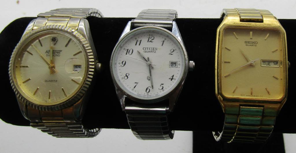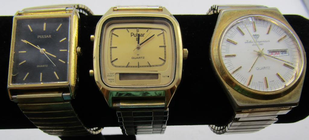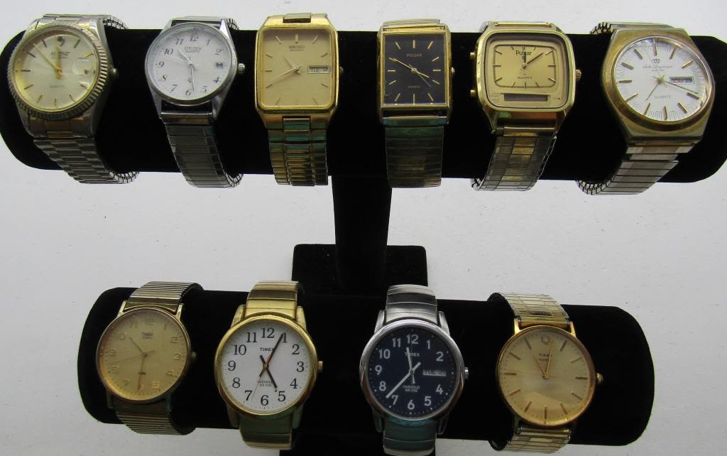 NOT TESTED AS TO WORKING OR NOT-SOME FOR PARTS OR REPAIRS-SOME MAY WORK:-MOST WILL NEED BATTERY REPLACEMENT(4)TIMEX-SEIKO-(2)PULSAR-NELSONIC- CITIZEN-JULES JURGENSEN-MISC