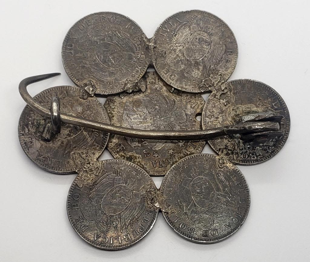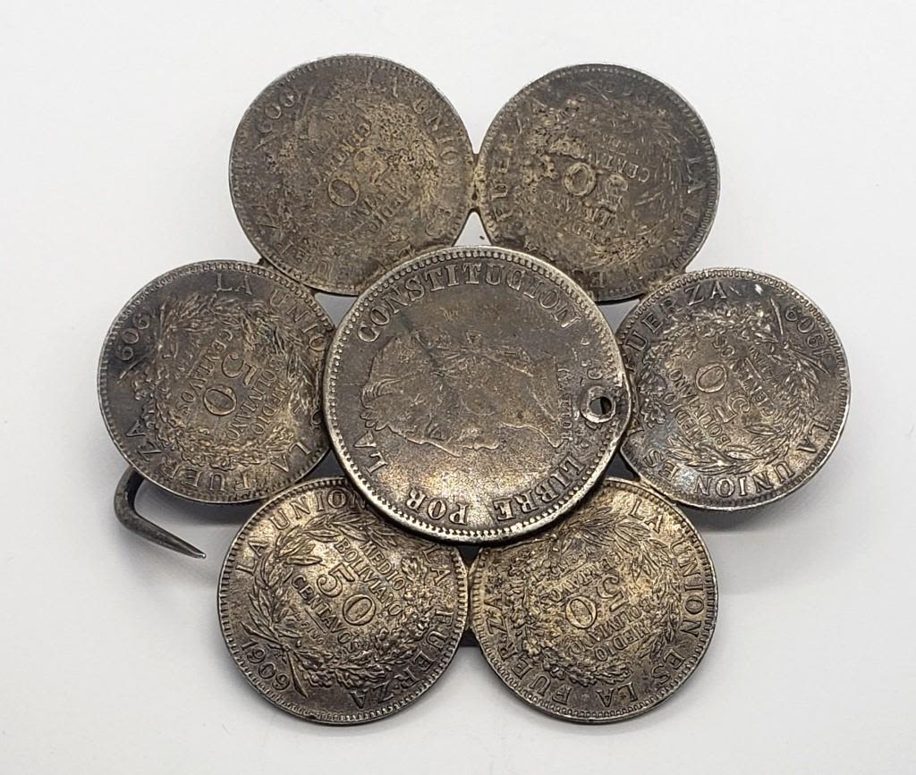 6-50 CENTAVOS, 1-LIBRE POR LA CONTITUCION 4 SOLS? SILVER COIN – HANDCRAFTED INTO BELT BUCKEL – 61.7 DWT