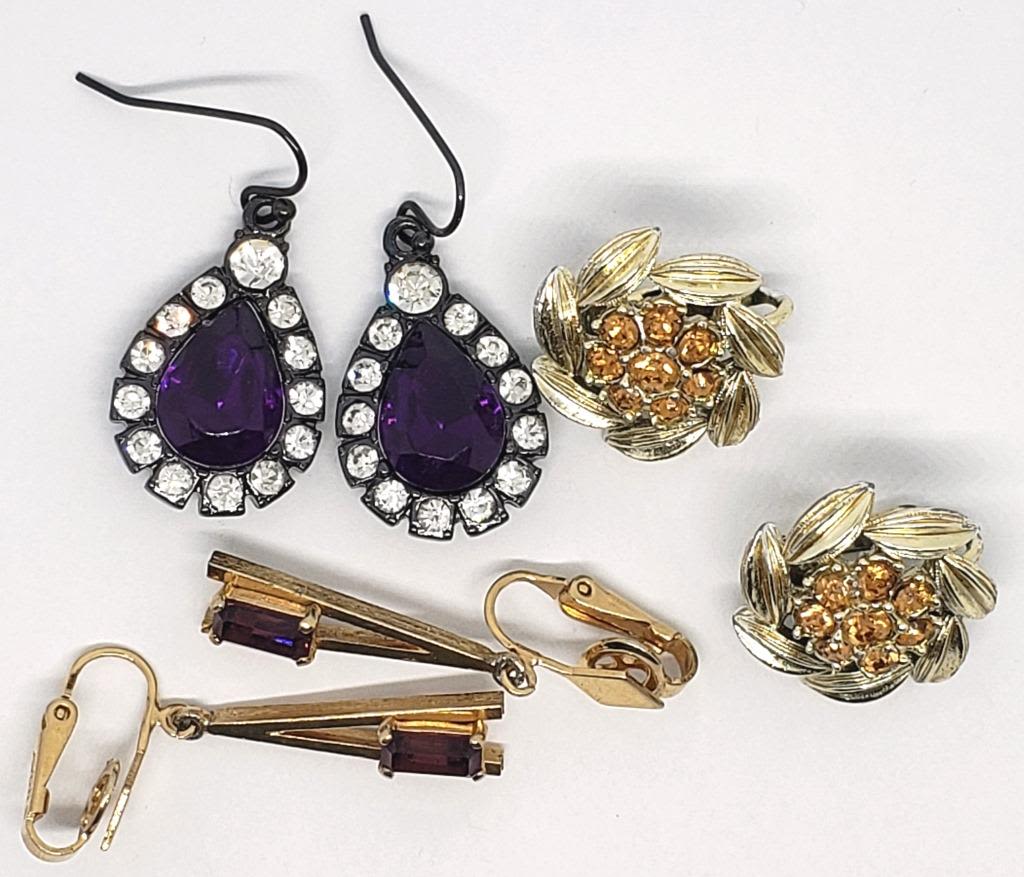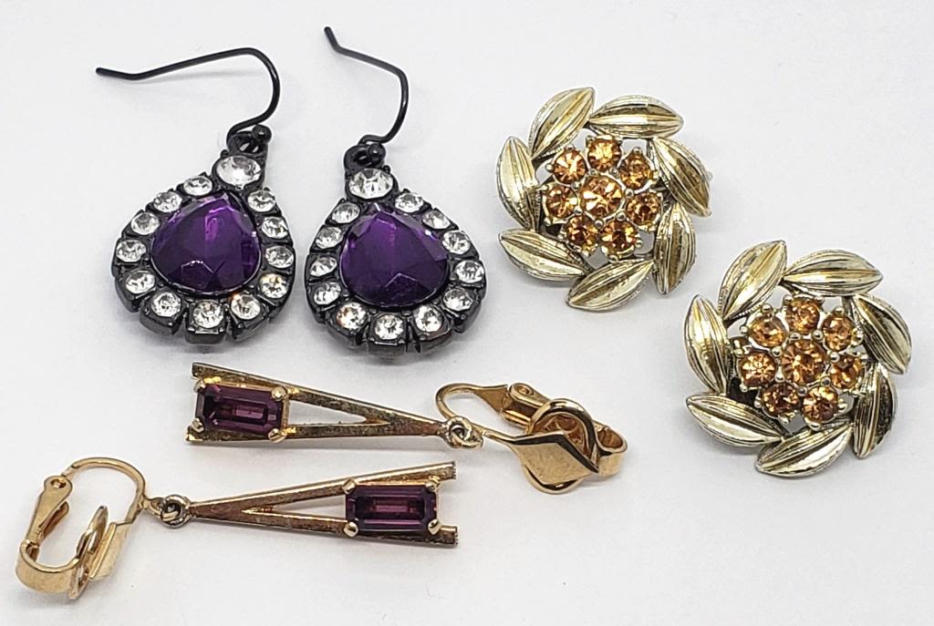 PURPLE AND YELLOW RHINESTONES; 1 MARKED "AVON"