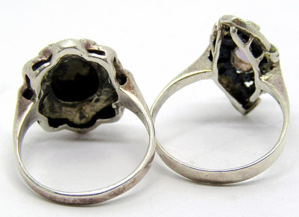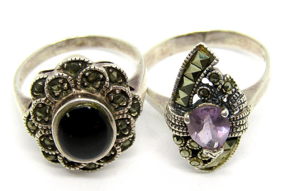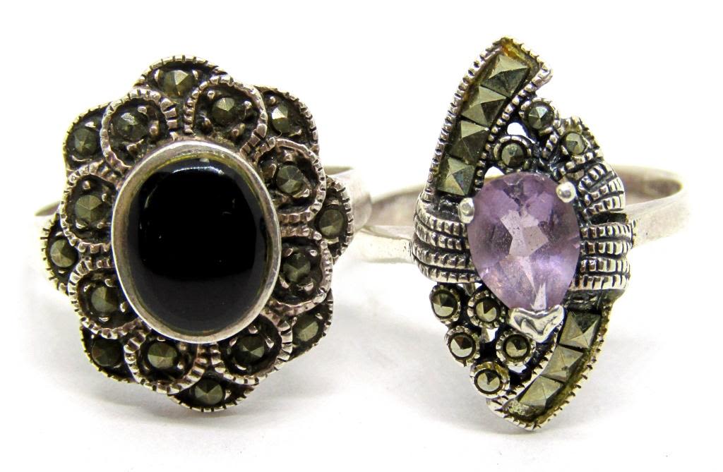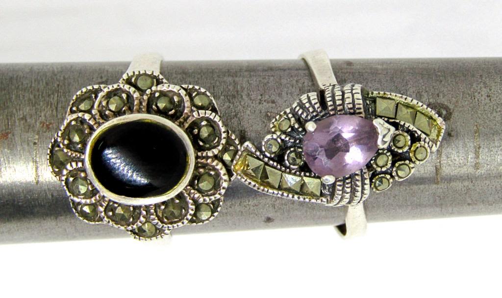 (1)WITH BLACK ONYX CENTER STONE (1)WITH LAVENDER CENTER STONE-BOTH RINGS SIZE 8-TOTAL 5.5 DWT