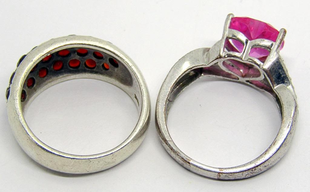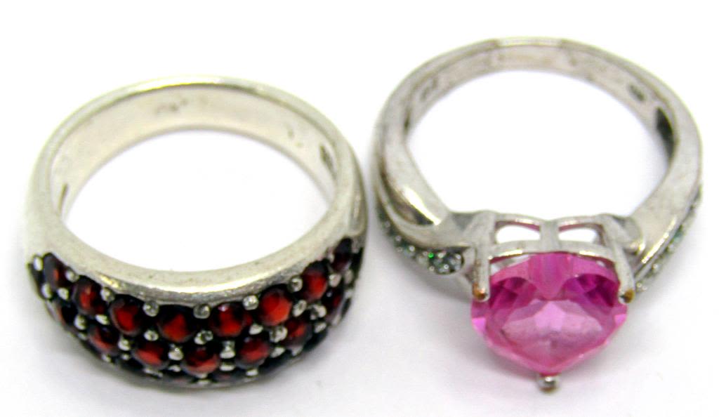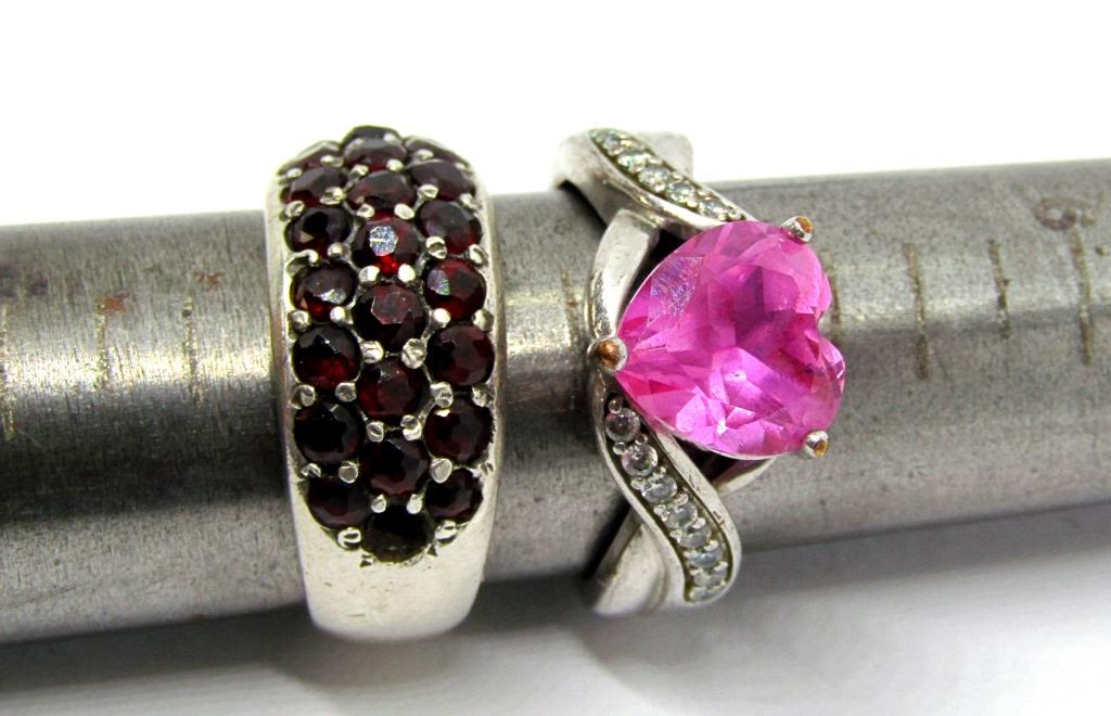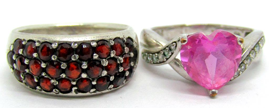 STONES (1)WITH PINK HEART CENTER STONE WITH CLEAR STONE ACCENTS-BOTH RING SIZE 8.5-TOTAL 7.3 DWT