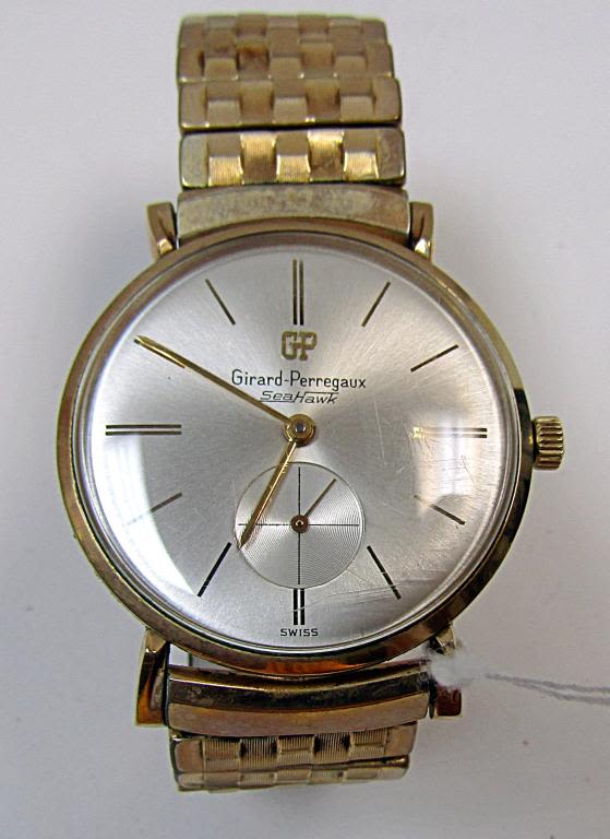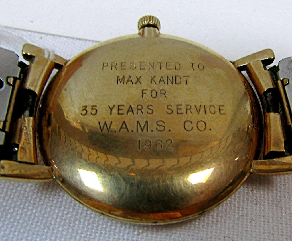 MANUAL WIND DRESS WATCH w/GOLD FILLED STRETCH BAND. RUNNING- BACK w/ENGRAVED CORP. AWARD DATED 1962
