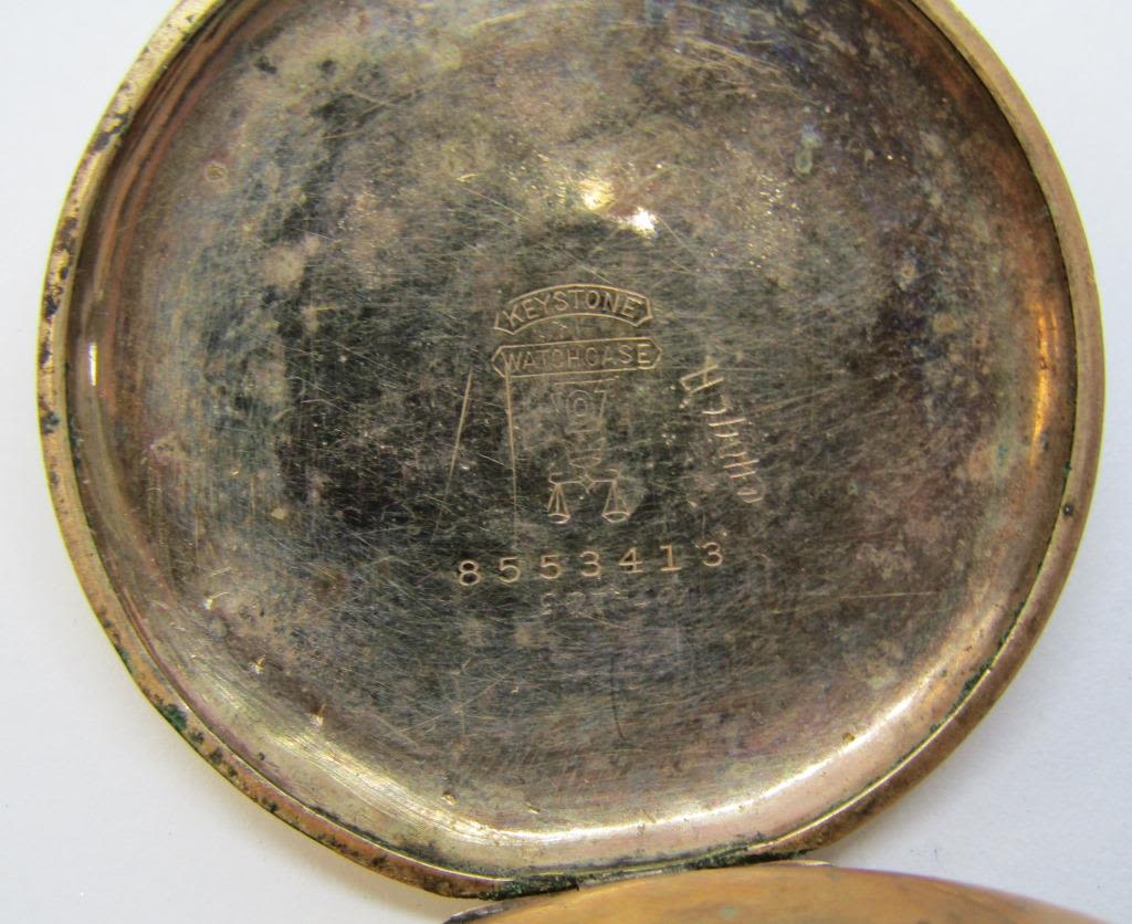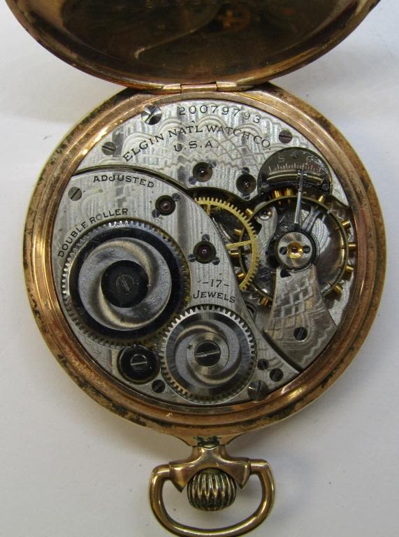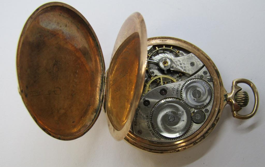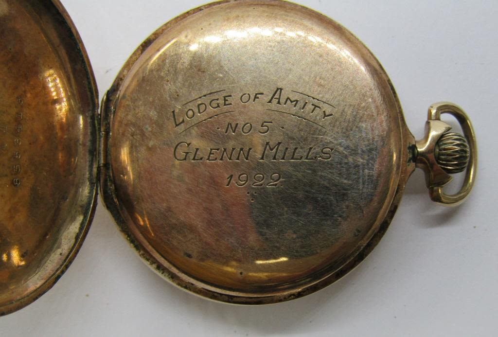 12 SIZE, 17 JEWEL, GOLD FILLED CASE, BACK w/EMBOSSED & ENAMELLED MASONIC SYMBOLS – WORKING CONDITION