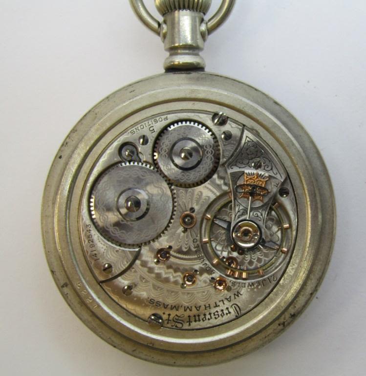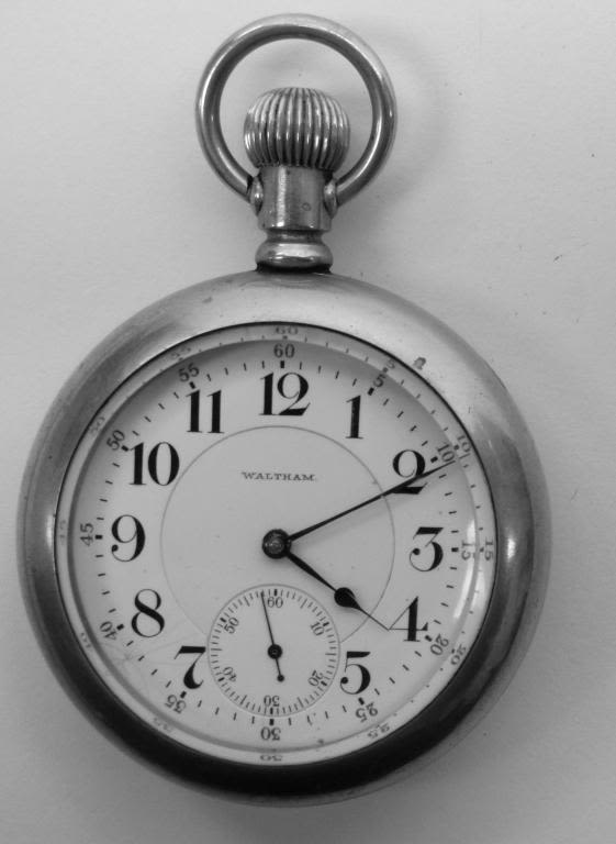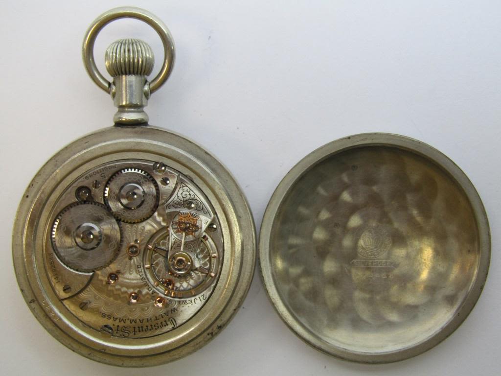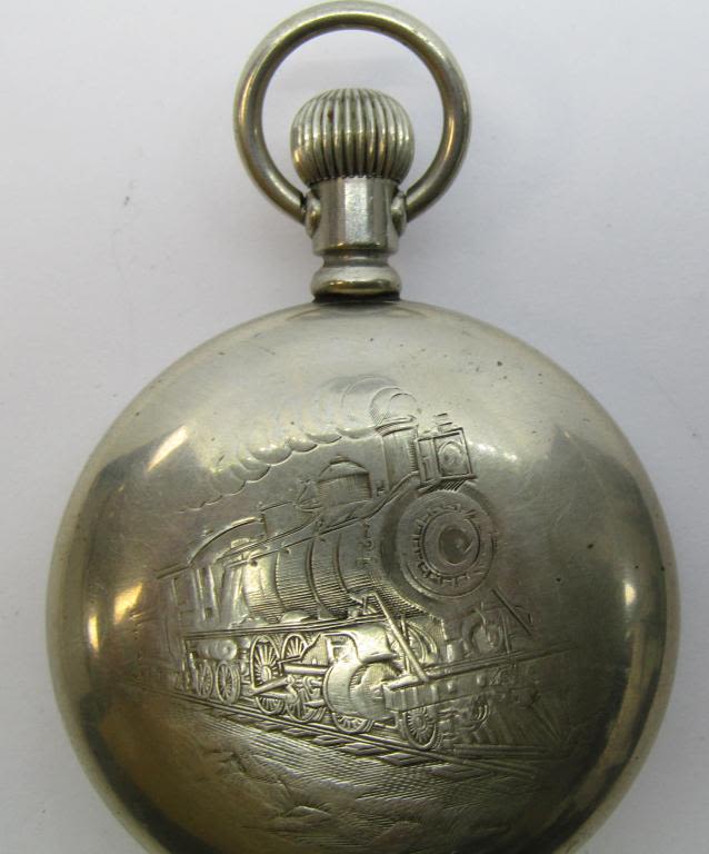 POCKET WATCH, 21 JEWEL, NICKLE SCREWBACK CASE w/ LOCOMOTIVE ENGRAVED ON BACK COVER – SOLID – WORKING CONDITION