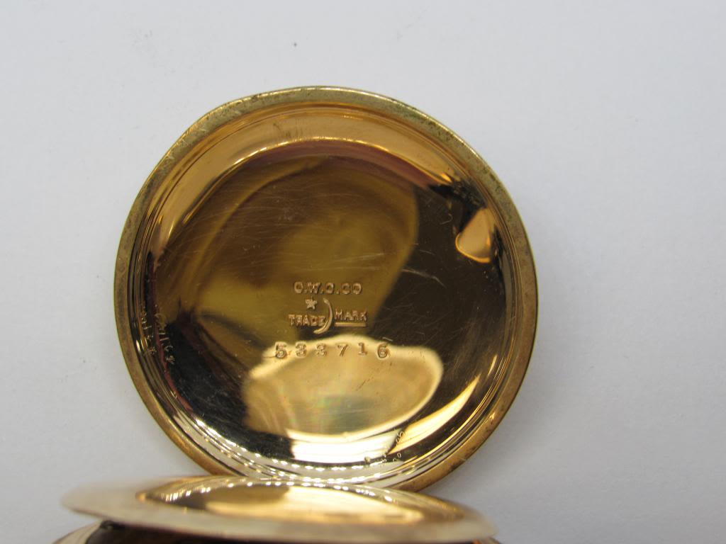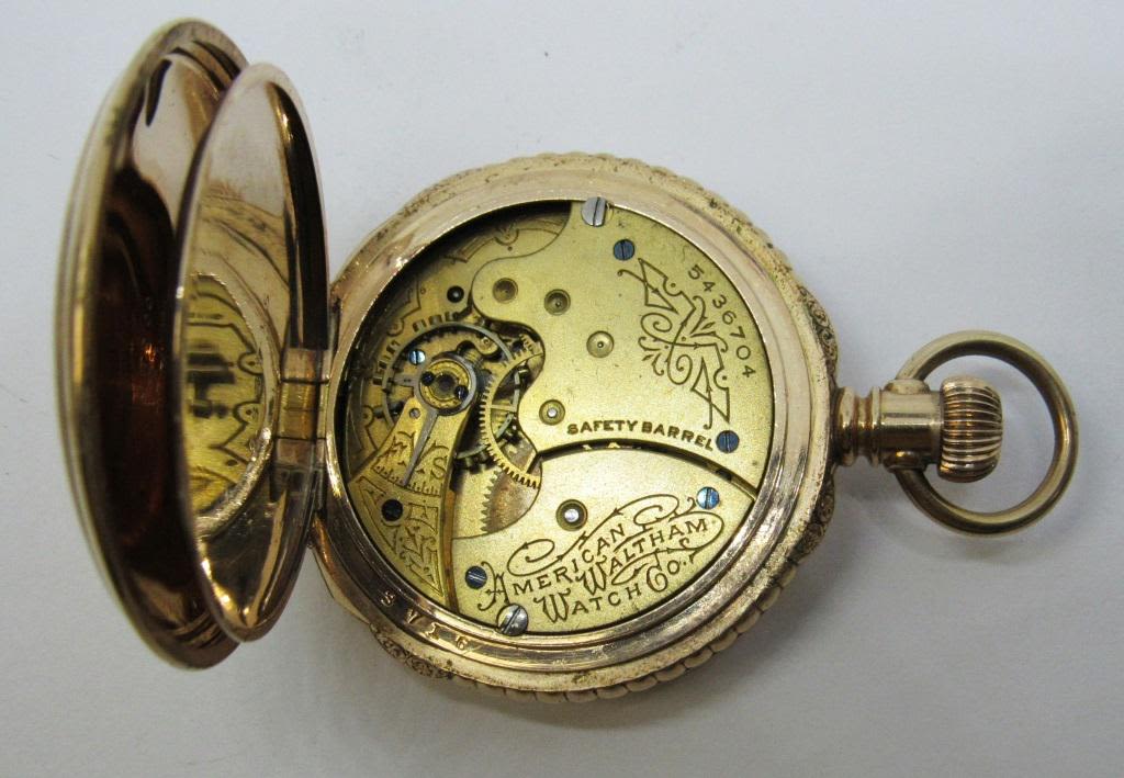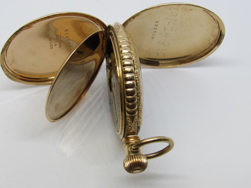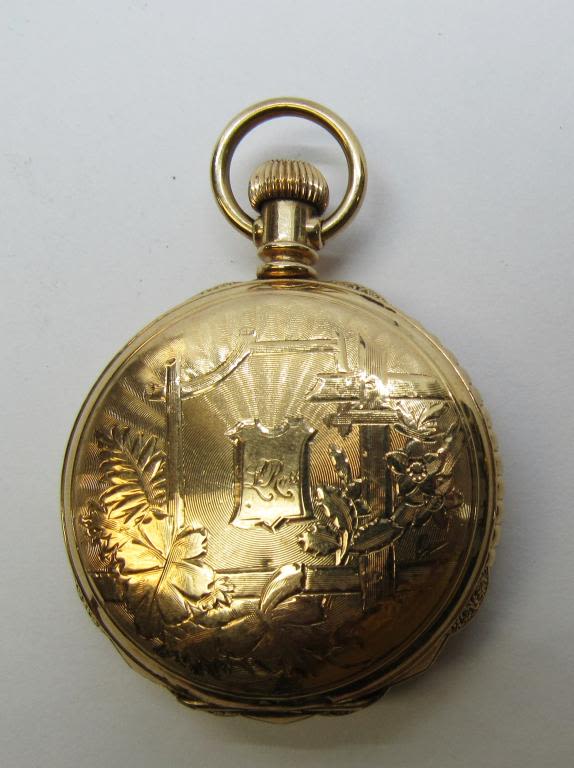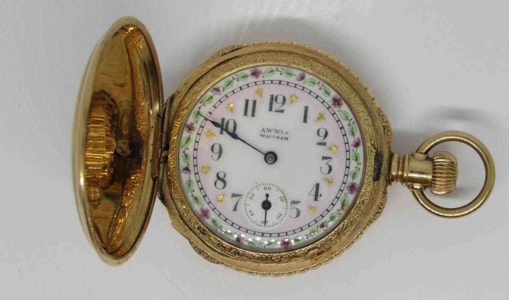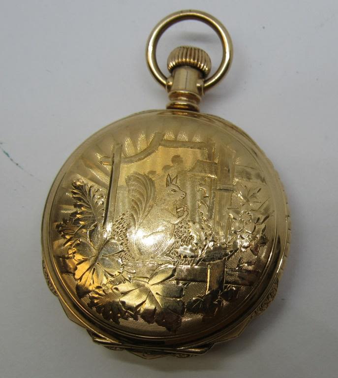 7 JEWEL, PERFECT MULTI-COLOR DIAL, FANCY ENGRAVED YELLOW GOLD FILLED HUNTING CASE w/SQUIRREL NICE – WORKING CONDITION