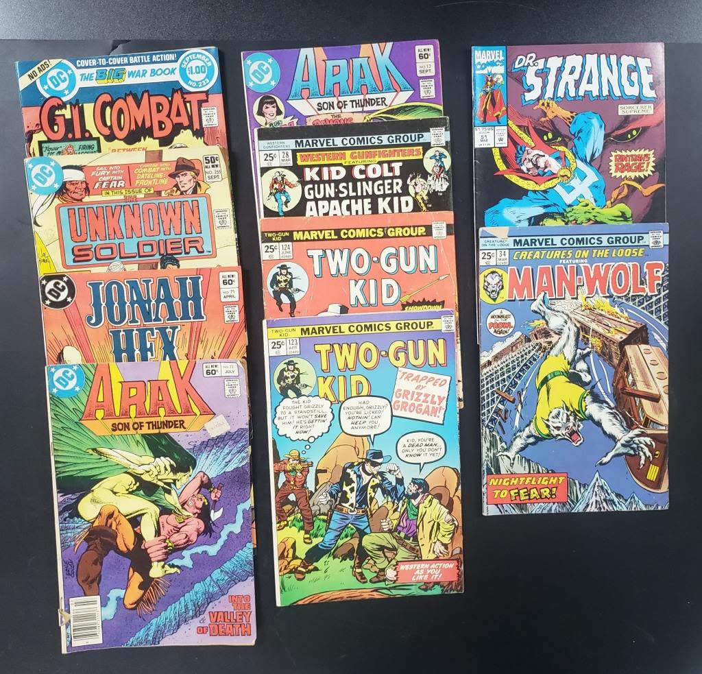 UNKOWN SOLDIER, JOHAH HEX, ARAK #11 & #13, KID COLT, TWO-GUN KID, DR. STRANGE, MAN-WOLF (10 TOTAL COMICS)