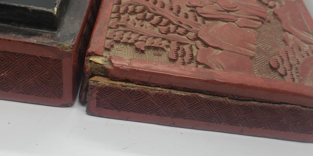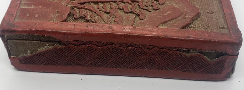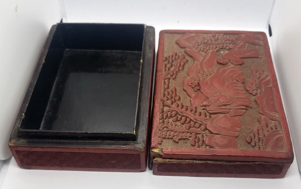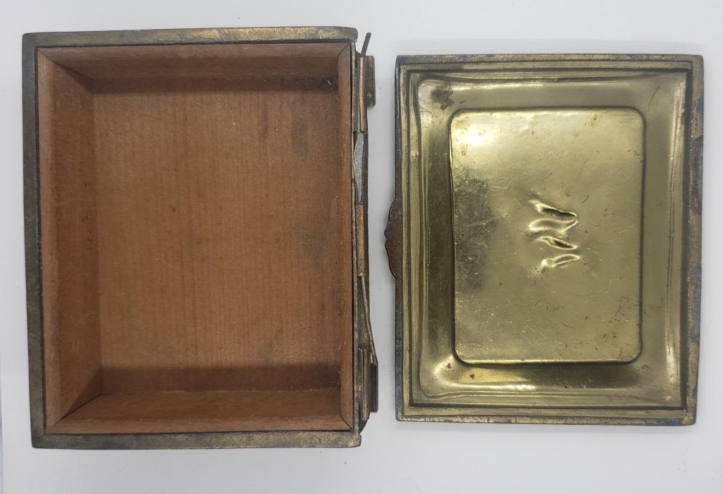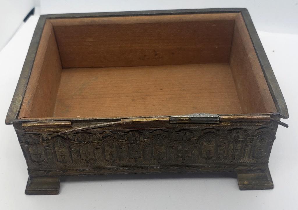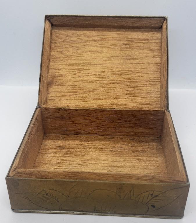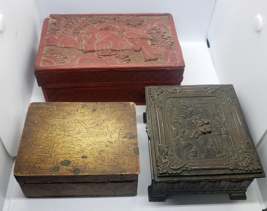 HAS SOME WEAR 5 1/2" X 4" X 2", WOOD / HAND CRAFTED TIN ORIENTAL COY? 4" X 3" X 1 1/2", OLD ENGLISH COUTRY SIDE (LID DETACHED) 4" X 3" X 1 3/4"