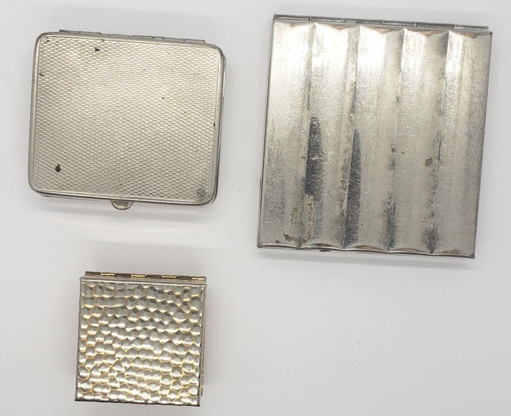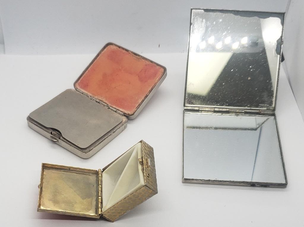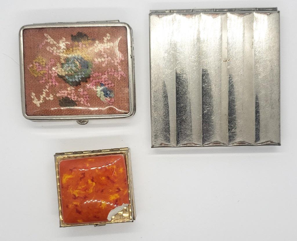 SILVER TONE MIRROR COMPACT, FLOWER CROSS STITCH POWDER COMPACT, ORANGE CERAMIC (CHIPPED) PILL BOX