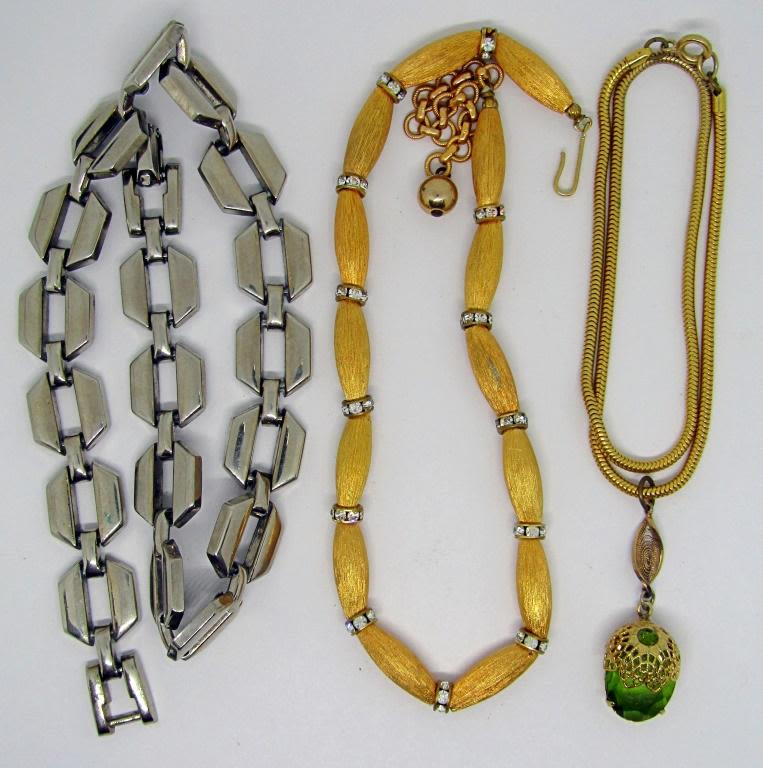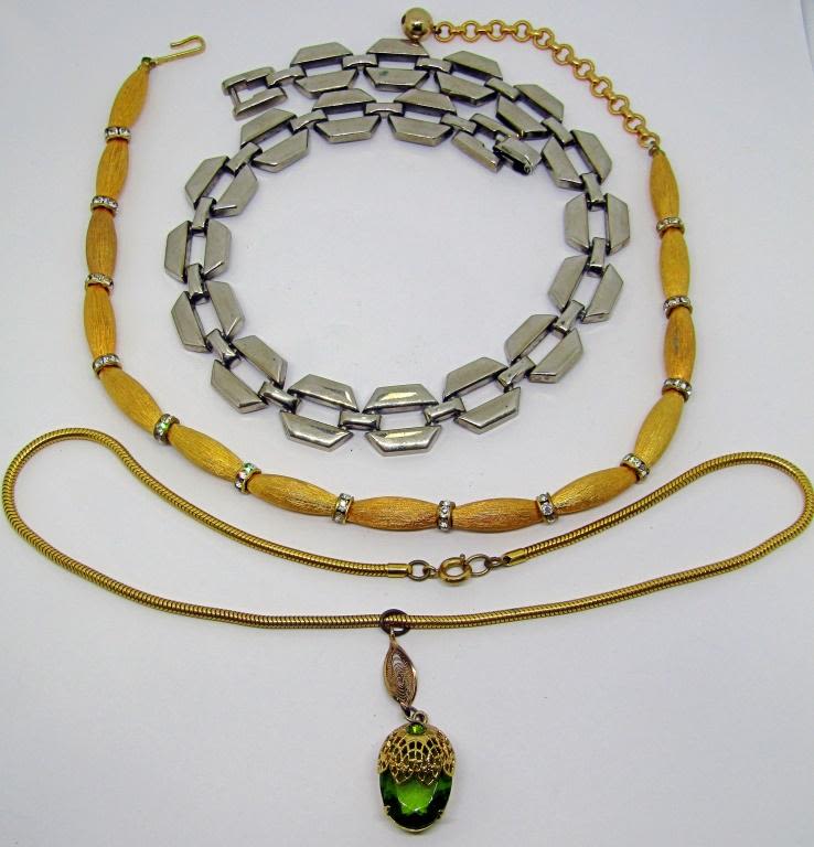JAYCRAFT SILVER LINK 15", GOLD OBLONG BEAD SATIN FINISH 15", GOLD TONED w/GREEN FACETED GLASS PENDANT 15"