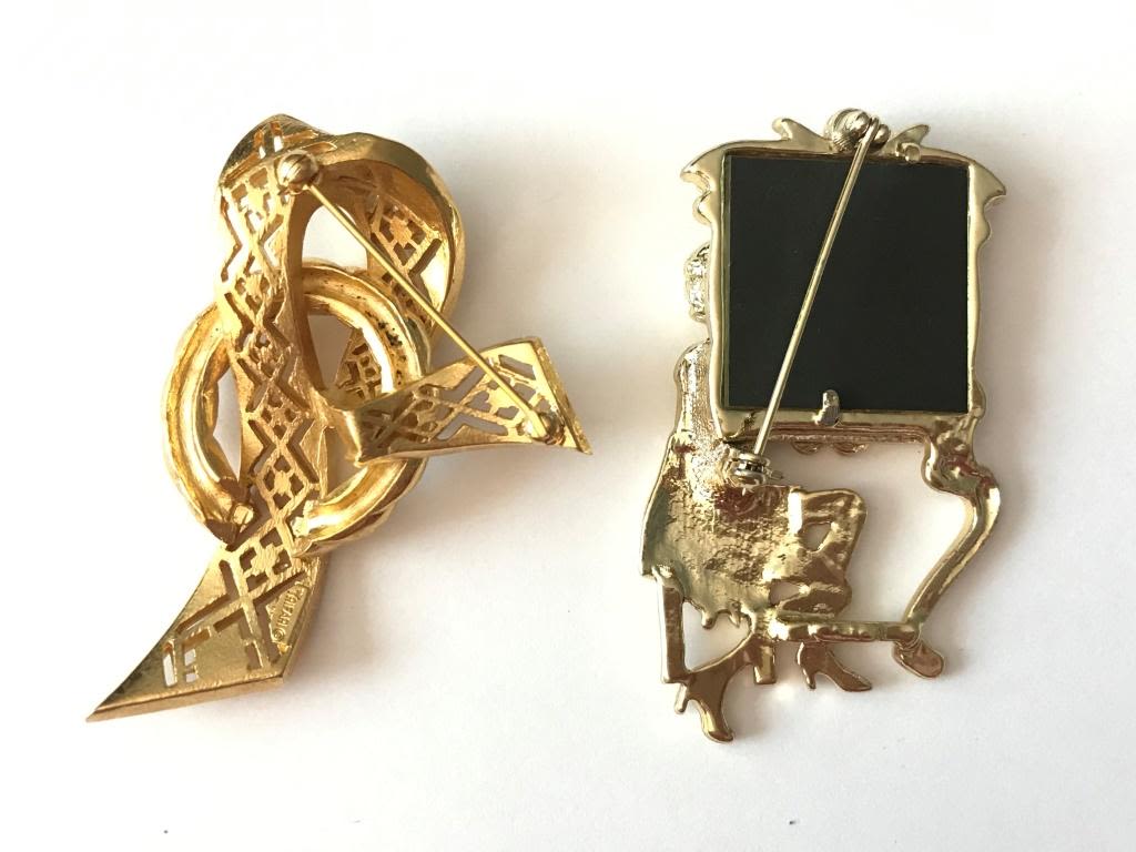 BROOCH 1-RIBBON/CIRCLE MARKED TRIFARI, BROOCH 2- WOMAN APPLYING MAKE UP IN THE MIRRIOR- VERY DETAILED AND PRETTY!!