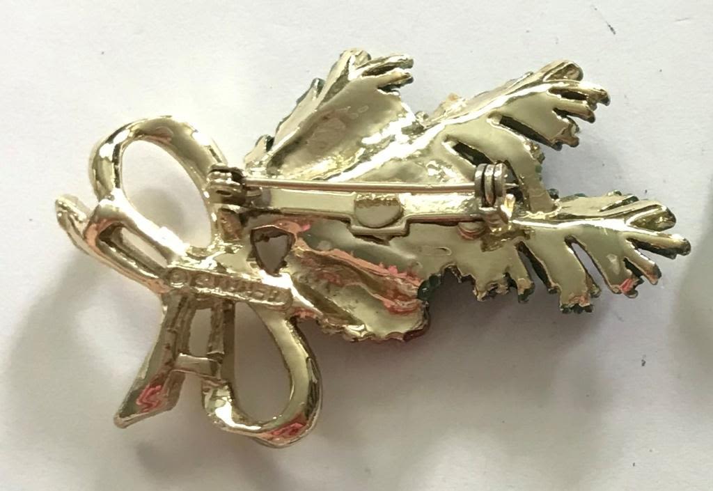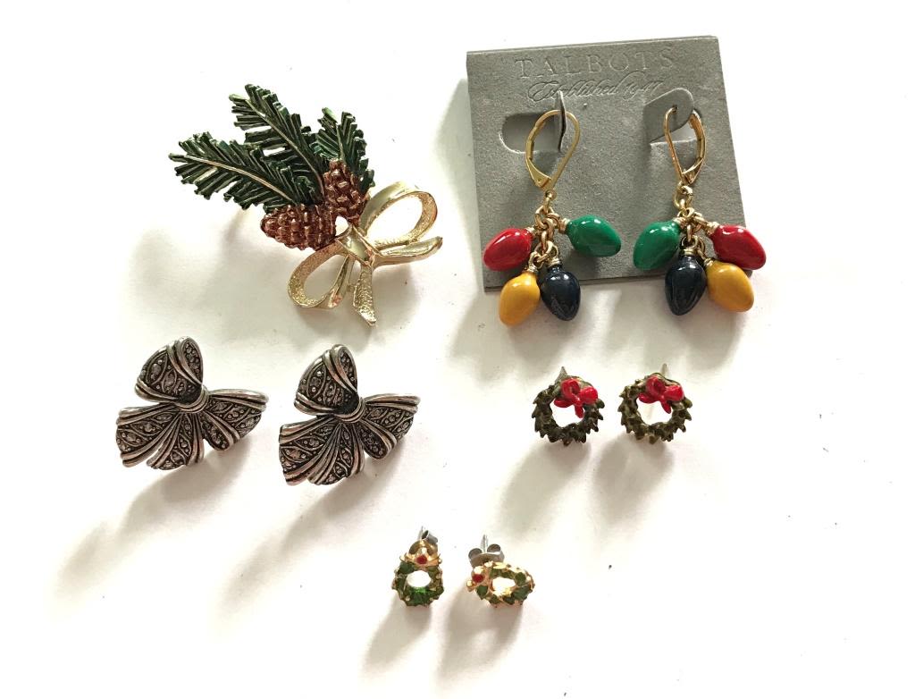 4 PAIRS OF EARRINGS, 1 BROOCH PINE CONES, BOW, WREATHS, CHRISTMAS LIGHTS 1 MARKED (POSSIBLY GERRY’S)