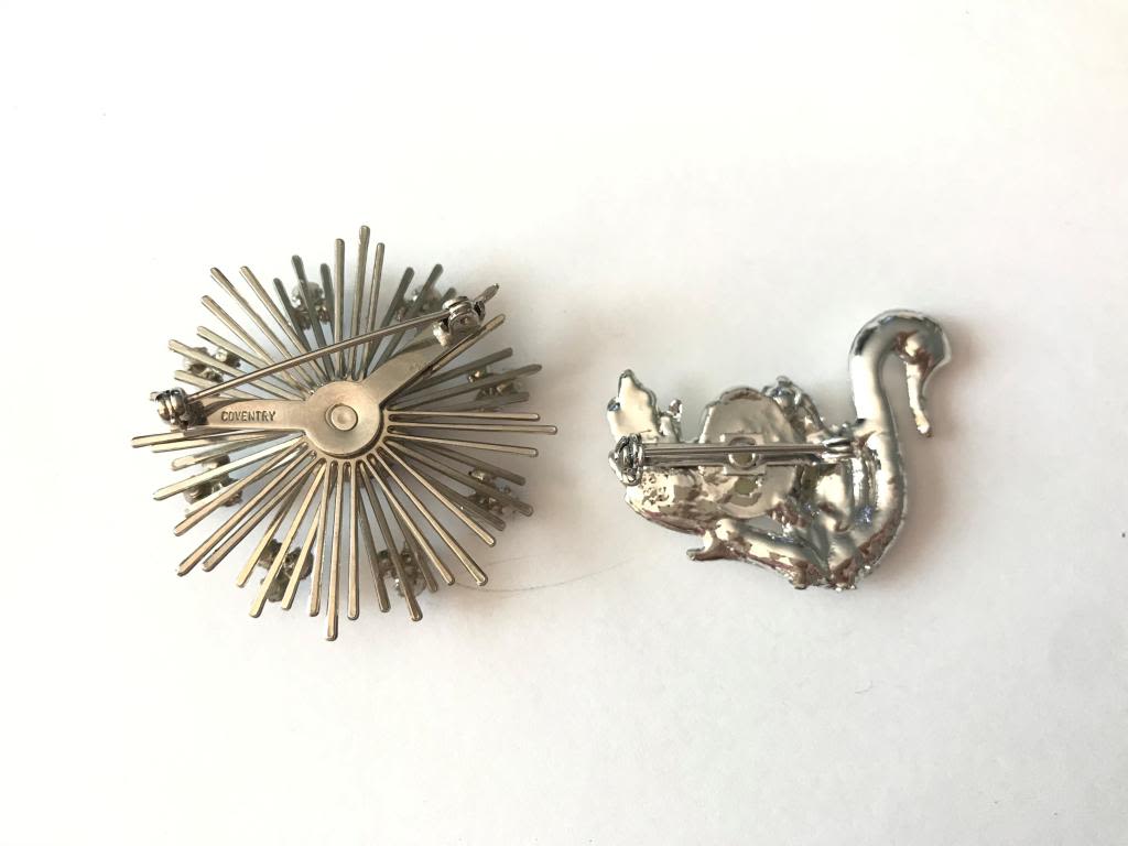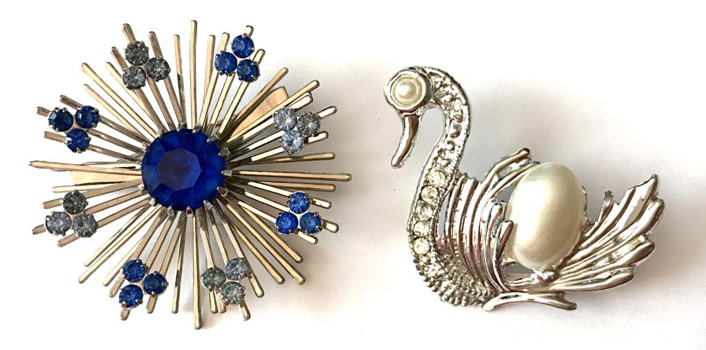 SWAN HAS FAUX DIAMONDS & PEARL STARBURST HAS LIGHT BLUE AND DARK BLUE SHADED STONES
