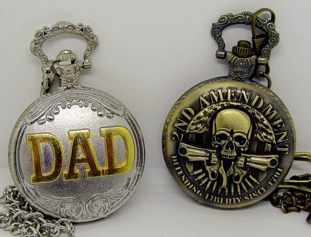 CASINGS HAVE "DAD" ENGRAVED ON IT AND THE OTHER HAS "2ND AMENDMENT DEFENDING LIBERTY SINCE 1791". BATTERY OPERATED!