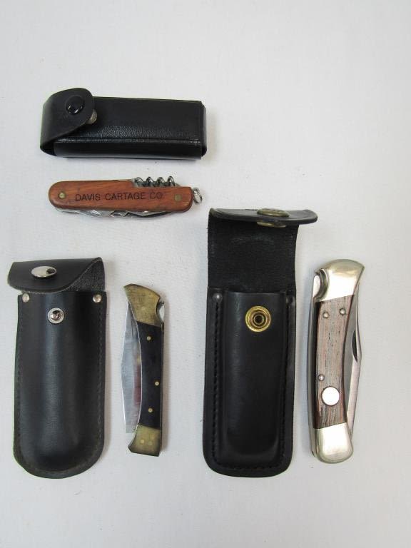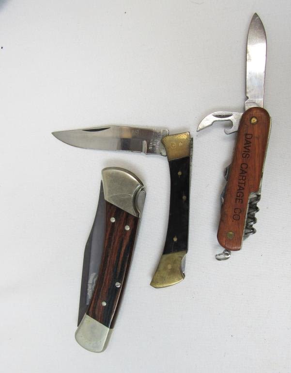 1 – CUMBERLAND MOUNTAINS BUCK KNIFE ( unable to get opened? – nice condition) , 1 – AK PAKISTAND STAINLESS STEEL KNIFE, 1 – MULTI TOOL KNIFE INSCRIBED WITH DAVIS CARTAGE CO.